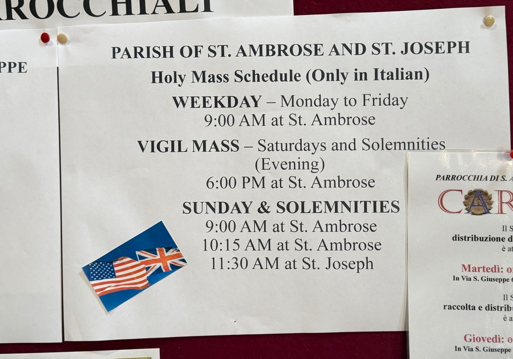 Over a few future posts I will be revealing the glories of the interior, which are much less modest than you might expect. But in this first post on the church, I will show you a few of the bulletins posted in the church, because I think it is always interesting to see what the church wants the parishioners to be aware of.