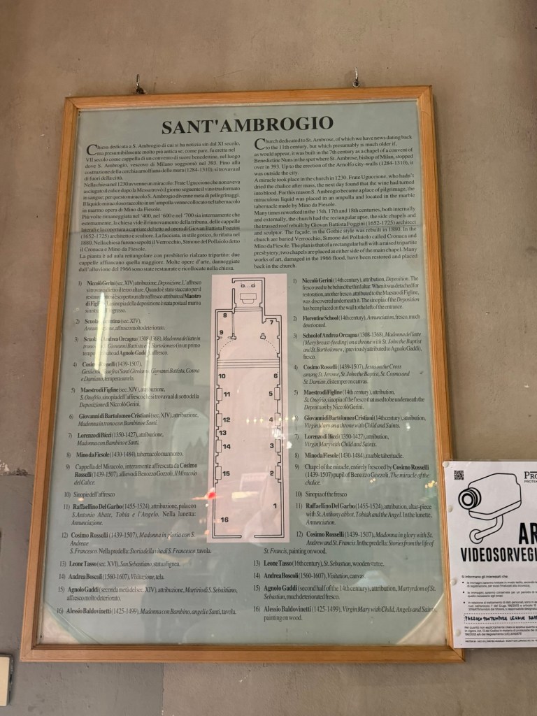 From this we learn that the church is named for Saint Ambrose, the Bishop of Milan, who stopped at this site in 393. A chapel for a convent of Benedictine nuns was built here as early as the 7th century, and the location of the church itself has been been dated to the 11th century at least. This location was outside the first city walls of Florence, until the erection of the Arnolfo circle of walls dating to 1284-1310.