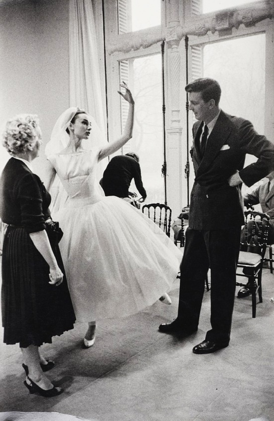 And here, in the photo, above we see a candid still of Audrey with Givenchy. She is modeling the wedding dress she wears in Funny Face and appears to be dancing some ballet steps.