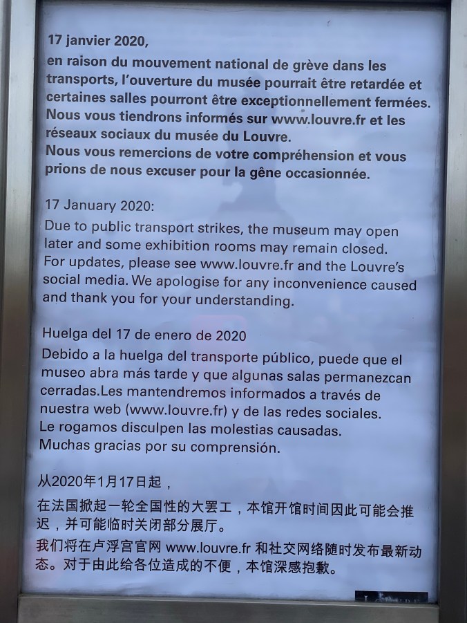 Uh oh, not my lucky day! I’ve had a ticket to see the Leonardo show at the Louvre for many months. When I arrived at the glass pyramid today, the employees were striking and no one could enter the museum. Boo hoo. Not lucky today.