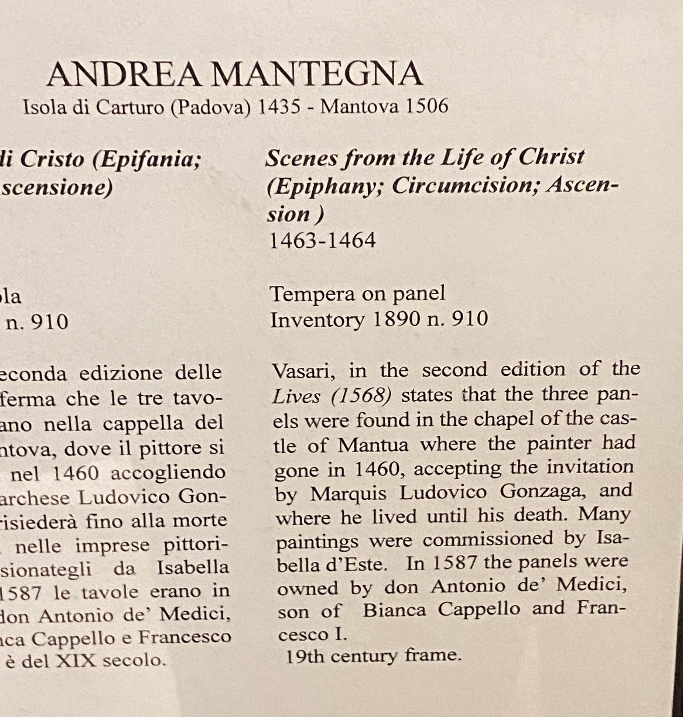 I will travel far and wide to see paintings by Andrea Mantegna. Fortunately, I only have to go into Florence’s centro to admire this lovely altarpiece by the talented quattrocento painter.