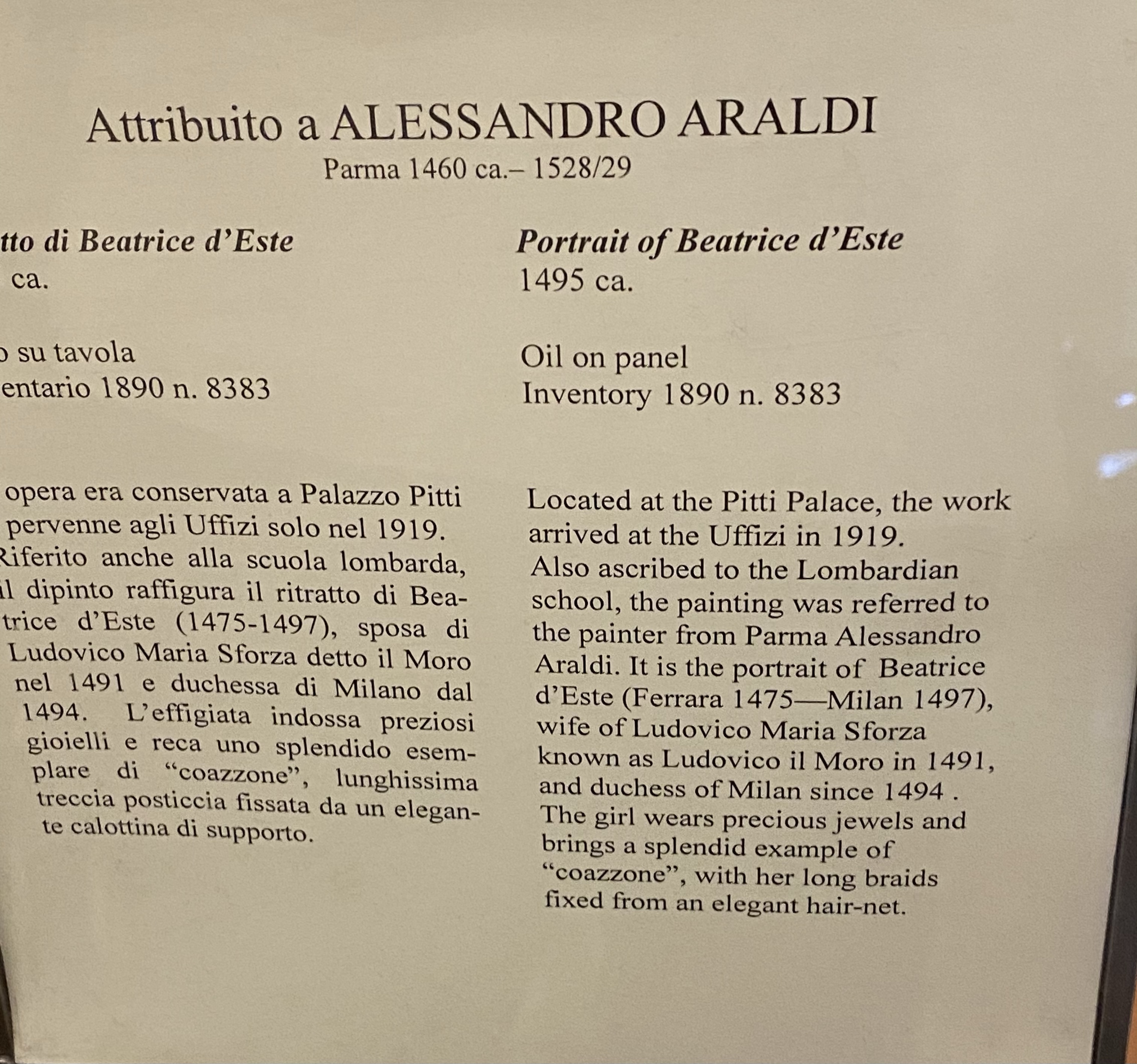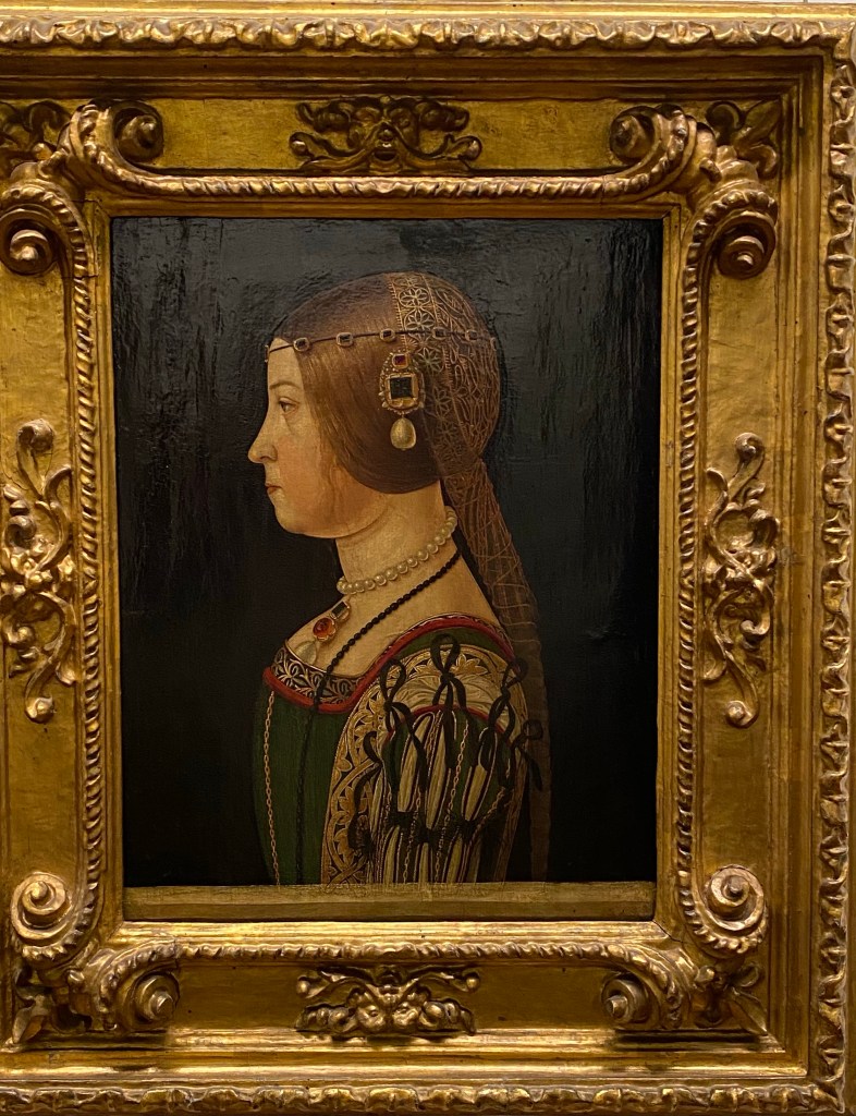 Beatrice d’Este is a fascinating Renaissance era woman and this portrait is stunning! Look at the way her hair is dressed; look at her incredible dress with its amazing sleeves. The jewels, the fabrics! Wow.