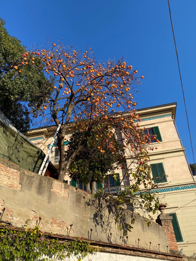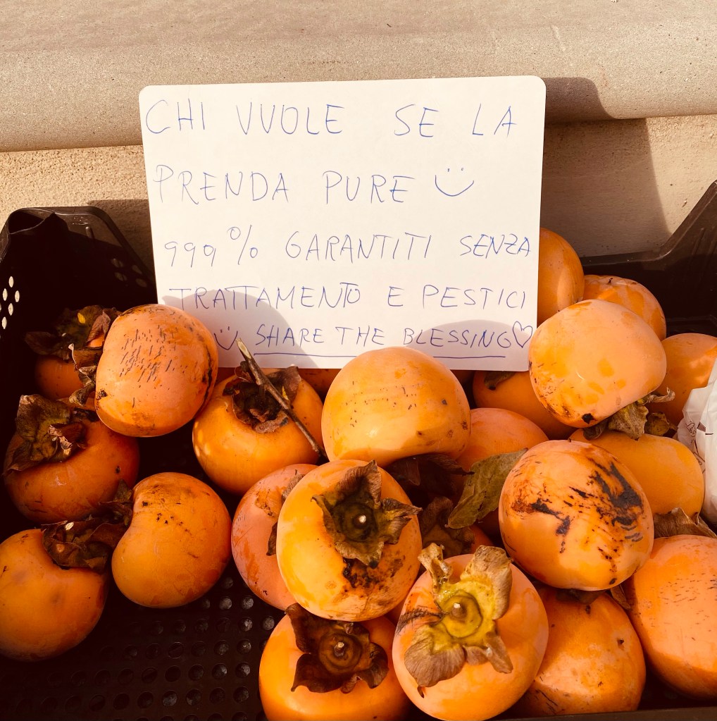 On a recent passeggiata, I came across this offering. Someone is sharing their persimmon bounty with passers by. They promise that the fruit are 999% pesticide free. With a promise like that, I helped myself to a couple. I don’t actually like the taste of persimmons, but I love their size, shape and color! Fall treasures!