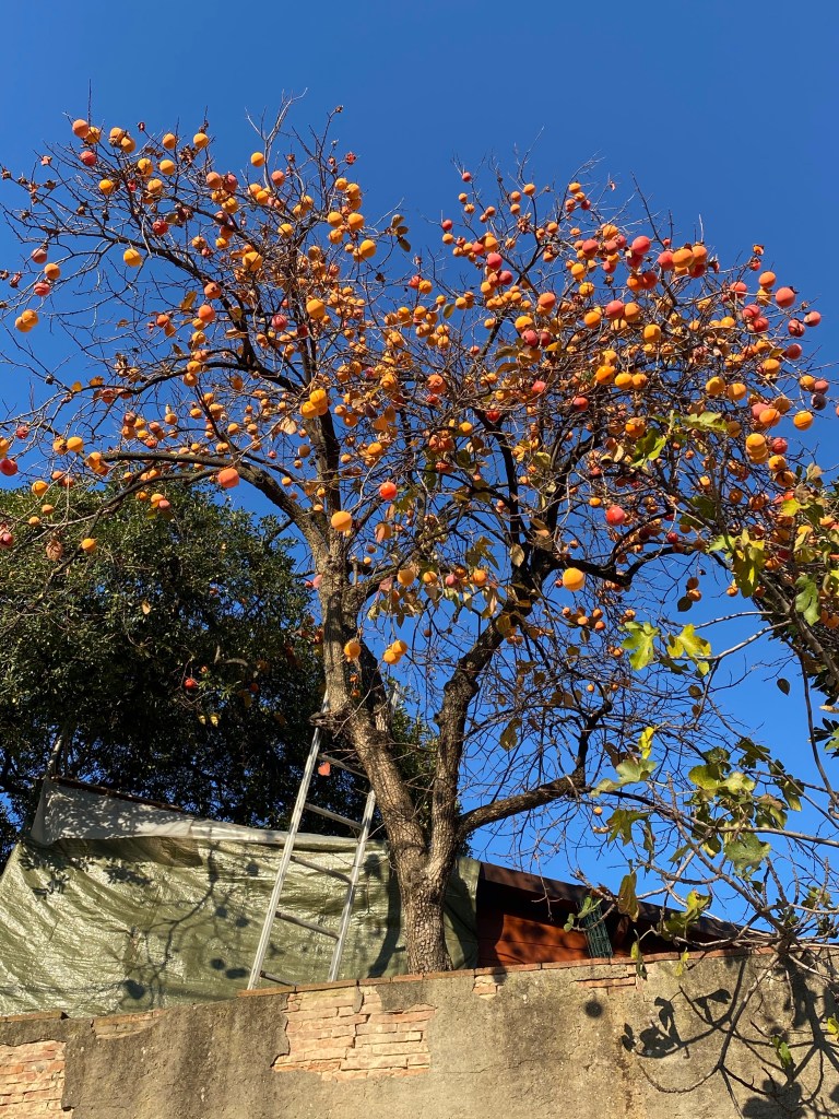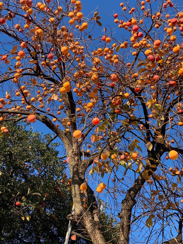 For me, living in this Mediterranean climate is living in a wonderland. I love the many trees and shrubs that grow in this setting. One of the wonders of the fall are persimmon trees. Once they have lost their leaves, they look like gigantic Christmas trees decorated with large orange globes. I love them.