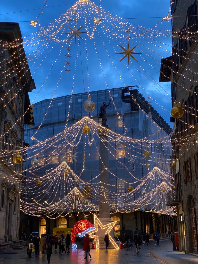Well, needless to say, Florence is different this Christmas. We in Tuscany are now in “zone orange” which gives us a lot more freedom to enjoy the city and the city made a valiant effort to decorate itself for the holidays, but there are fewer decorations than in years past. But, Via Tornabuoni is completely turned out and a joy to see!