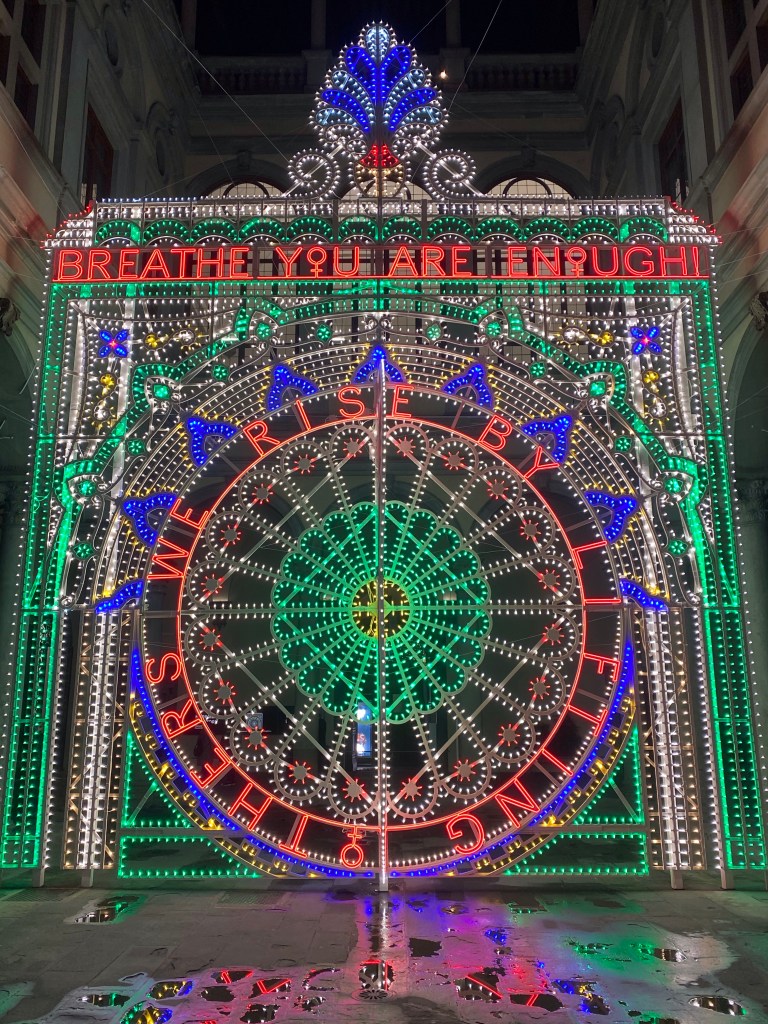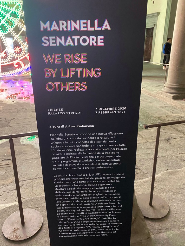 Hands down, my favorite holiday decoration in Florence this year is this spectacular light installation by Marinella Senatore at the Palazzo Strozzi. Love, love, love it!