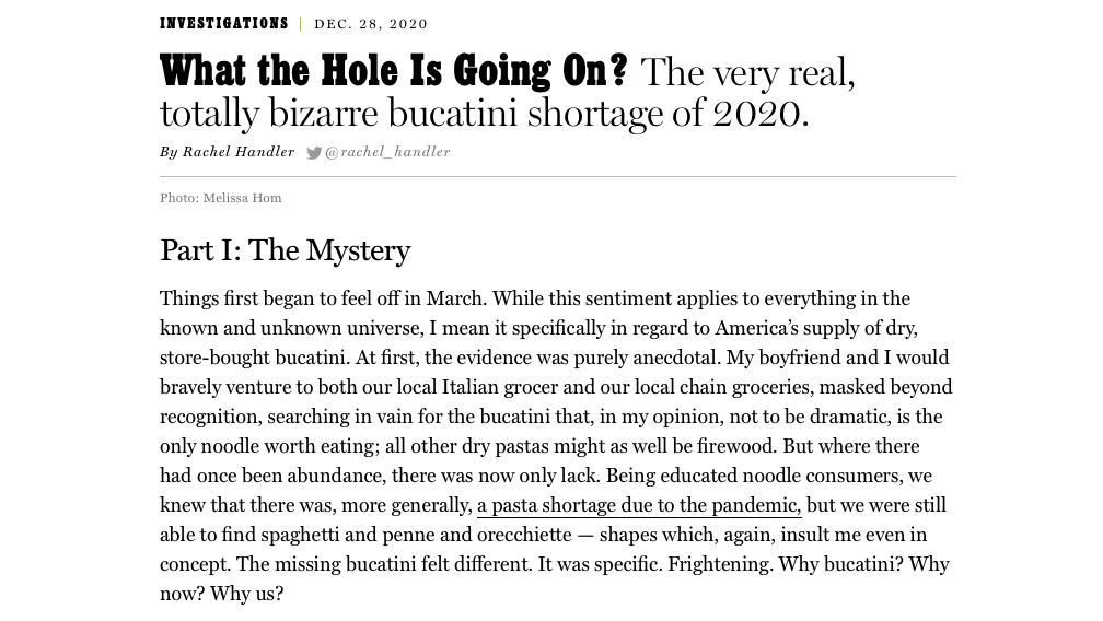 Do you do bucatini? December 29, 2020 / get back, laurettadimmick Please enjoy this fun article! https://www.grubstreet.com/amp/2020/12/2020-bucatini-shortage-investigation.html?__twitter_impression=true&fbclid=IwAR1QJoYJCDZFM_VODqN2c1qCGBqb7ea2GQqRlUMRdkE6NJqwxCEibaQsyxA Share this: Share on X (Opens in new window) X Share on Facebook (Opens in new window) Facebook More Share on Reddit (Opens in new window) Reddit Share on Tumblr (Opens in new window) Tumblr Share on Pinterest (Opens in new window) Pinterest Print (Opens in new window) Print Share on LinkedIn (Opens in new window) LinkedIn Email a link to a friend (Opens in new window) Email Like Loading...