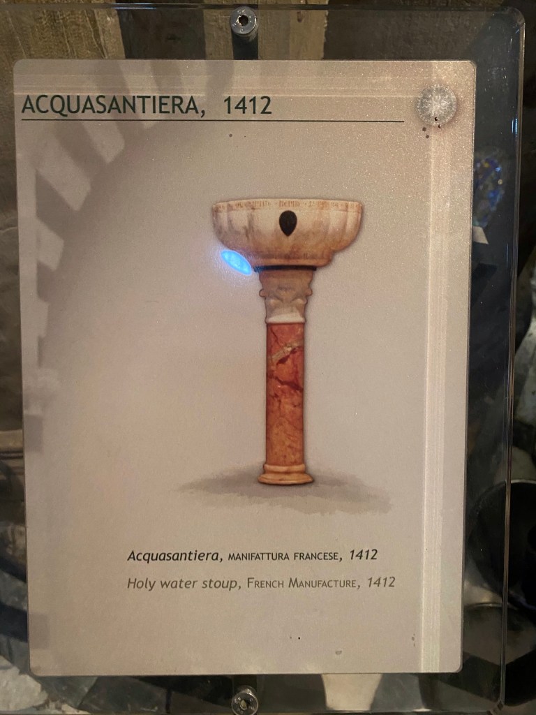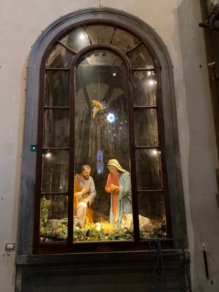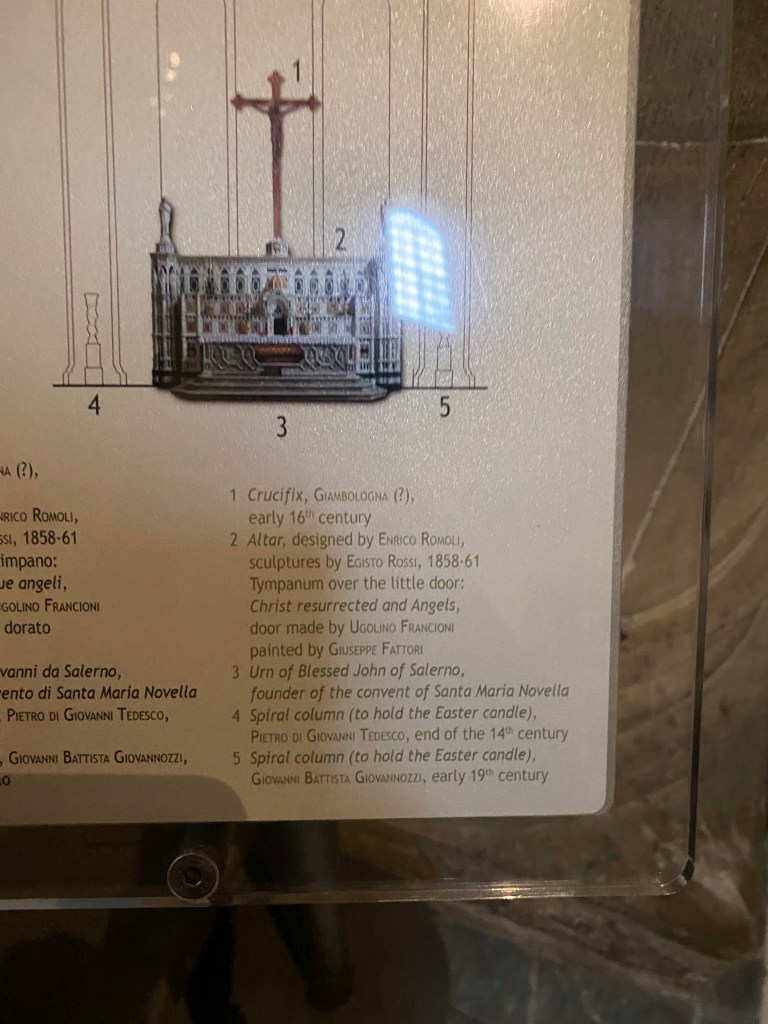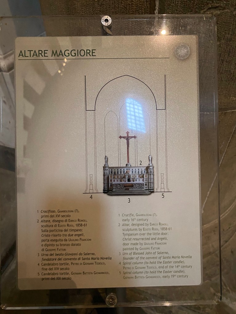 The Crucifixion by GiottoThere is a permanent creche in a chapel in Santa Maria Novella, in addition to the annual creche at the entrance of the basilica.A detail of the permanent creche.Aquasantiera, the name for the holy water stoup found in all Catholic churches. The one in Santa Maria Novella was made in France in 1412, according to this label.Another holy water stoup in Santa Maria Novella.I love the high altar at Santa Maria Novella, with a replica of the duomo dome.Info about the high altarInfo about the high altarLooking towards the entrance wall of the basilica, from the high altar. I was the only person in the basilica!