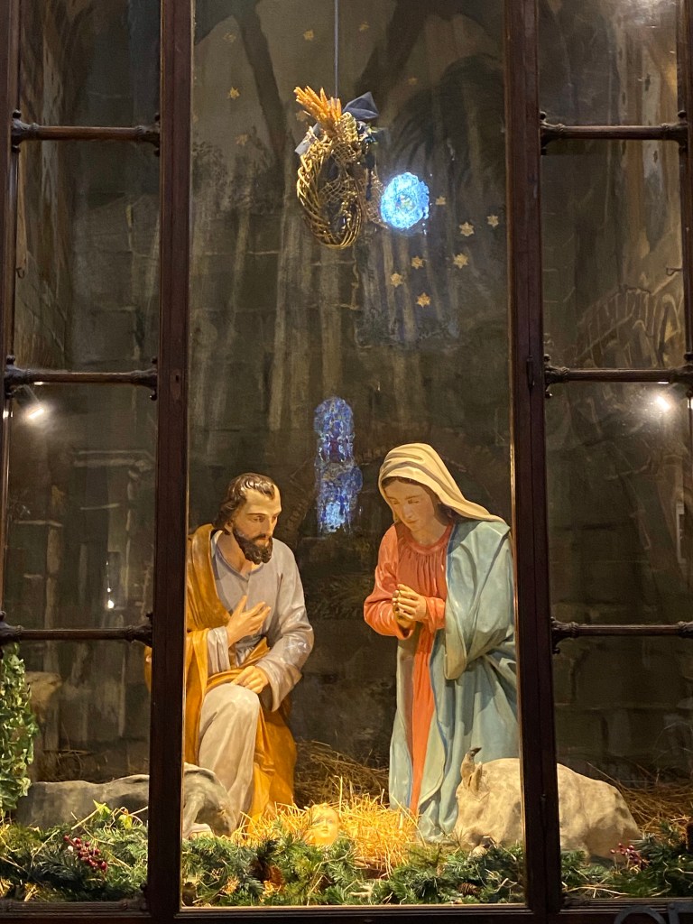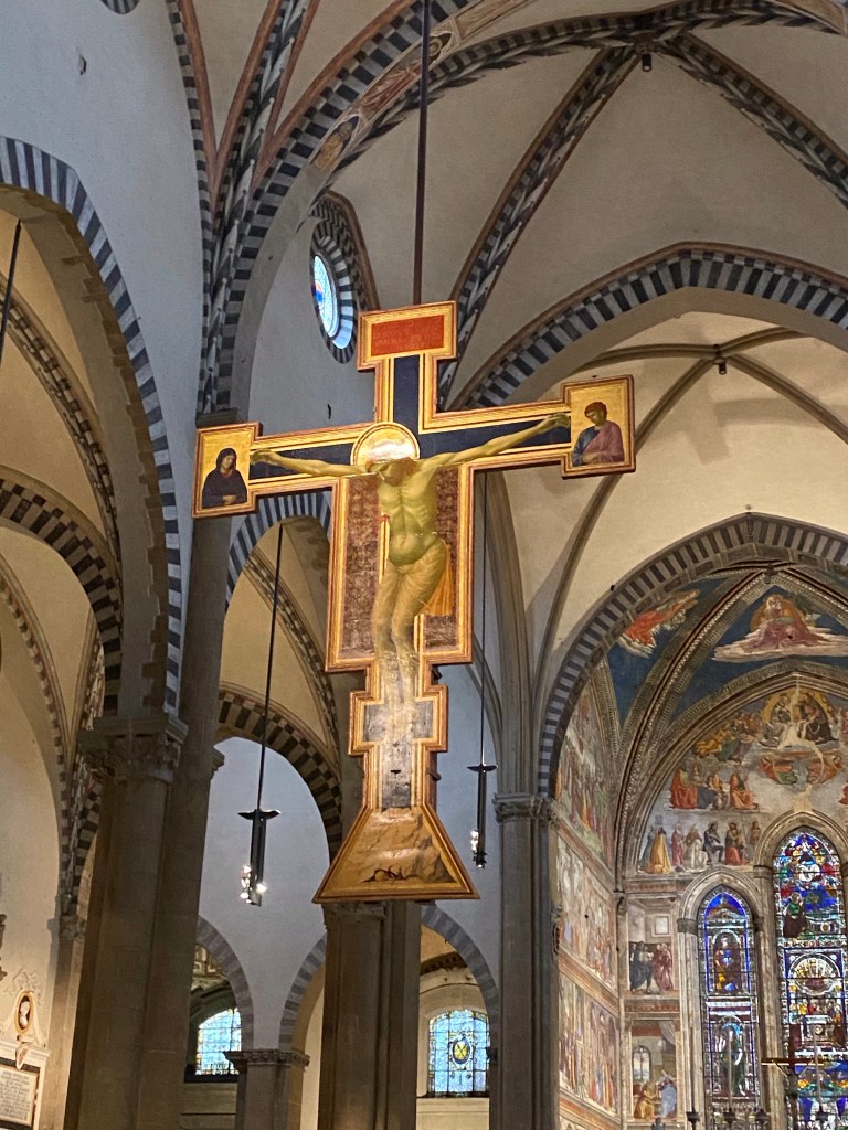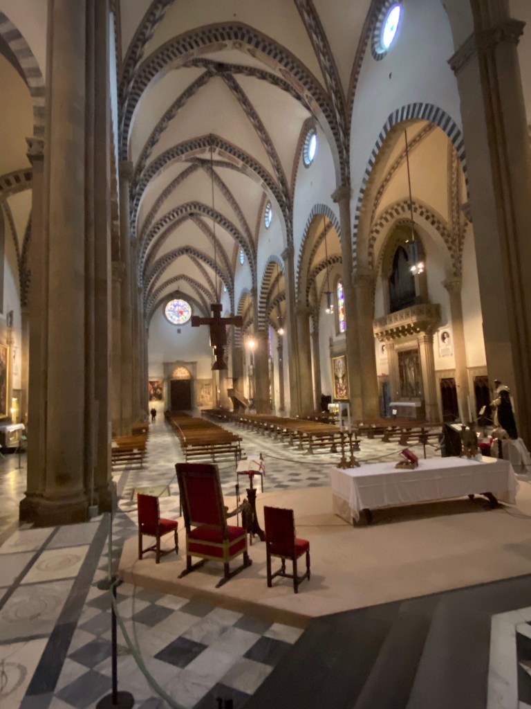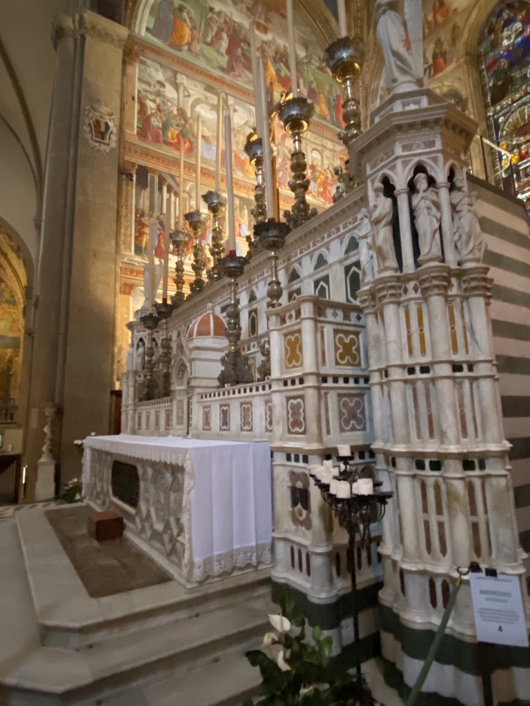 The Crucifixion by GiottoThere is a permanent creche in a chapel in Santa Maria Novella, in addition to the annual creche at the entrance of the basilica.A detail of the permanent creche.Aquasantiera, the name for the holy water stoup found in all Catholic churches. The one in Santa Maria Novella was made in France in 1412, according to this label.Another holy water stoup in Santa Maria Novella.I love the high altar at Santa Maria Novella, with a replica of the duomo dome.Info about the high altarInfo about the high altarLooking towards the entrance wall of the basilica, from the high altar. I was the only person in the basilica!
