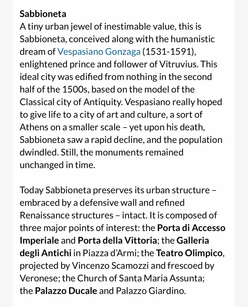 You want to see an “ideal city?” Head about 20 miles outside of Mantova and there you will find a made-to-order small city, created in full during the 16th century by the local Gonzaga ruling family.