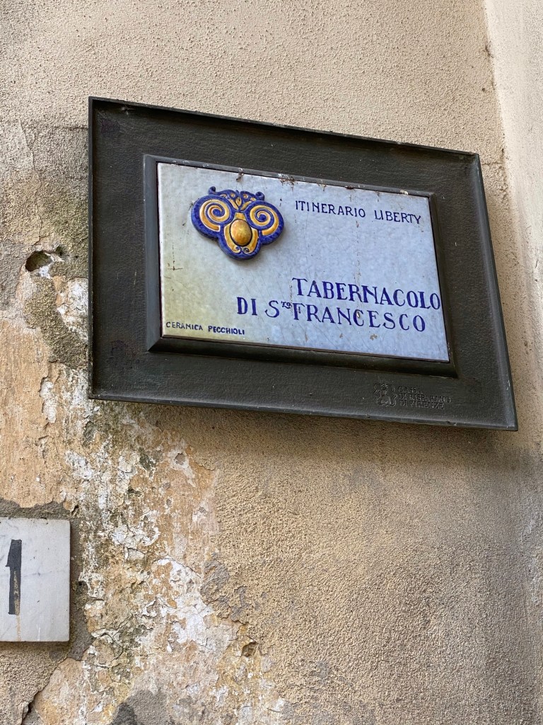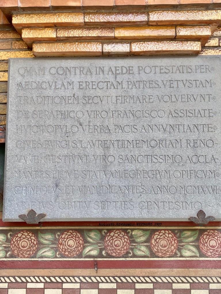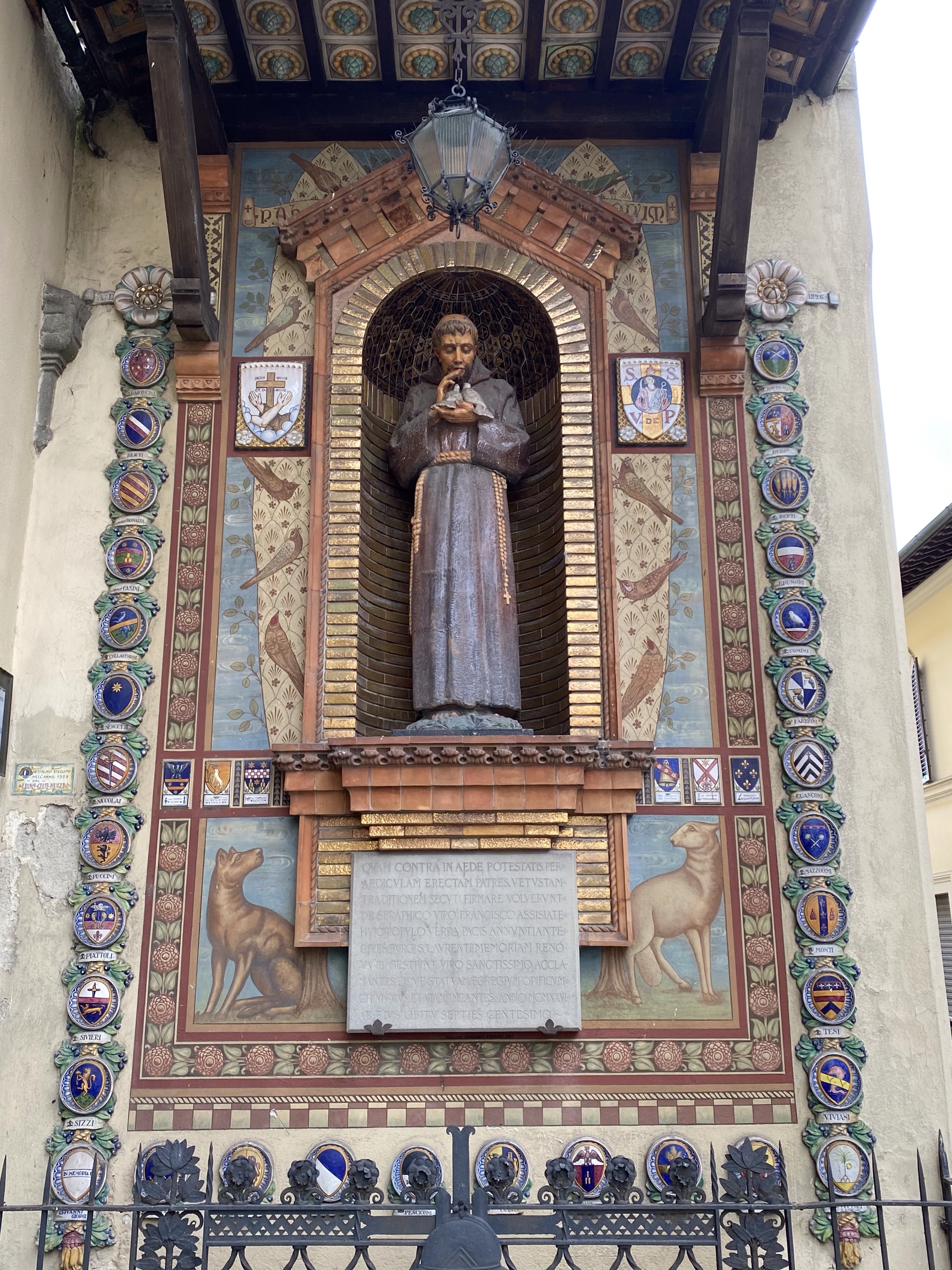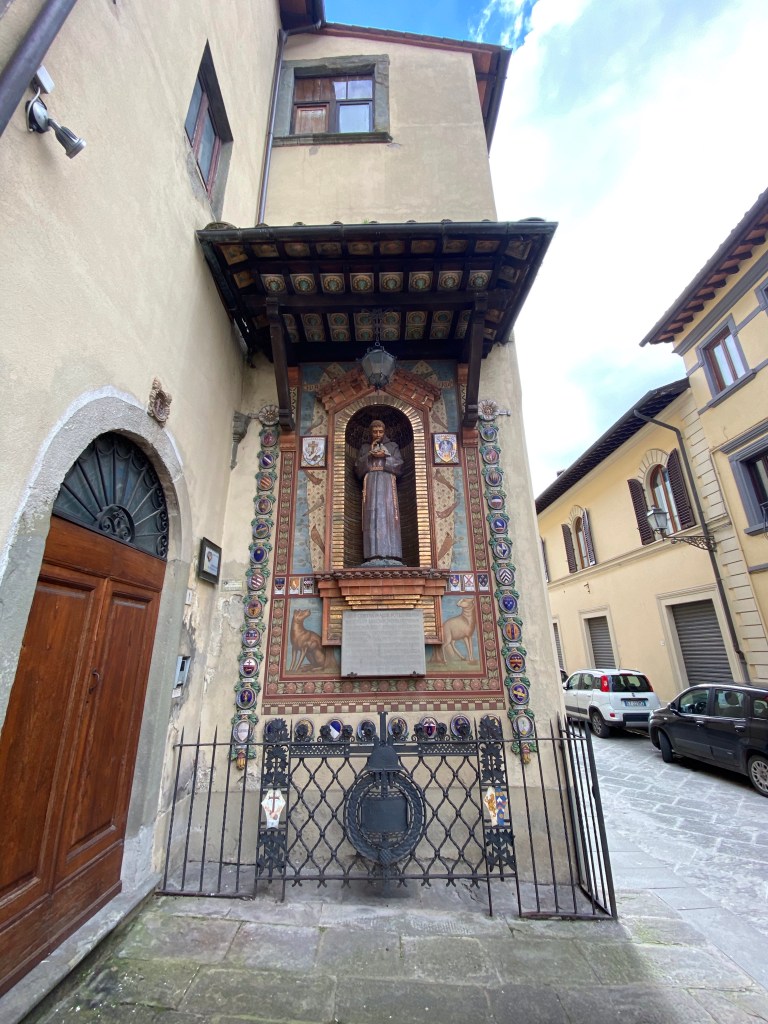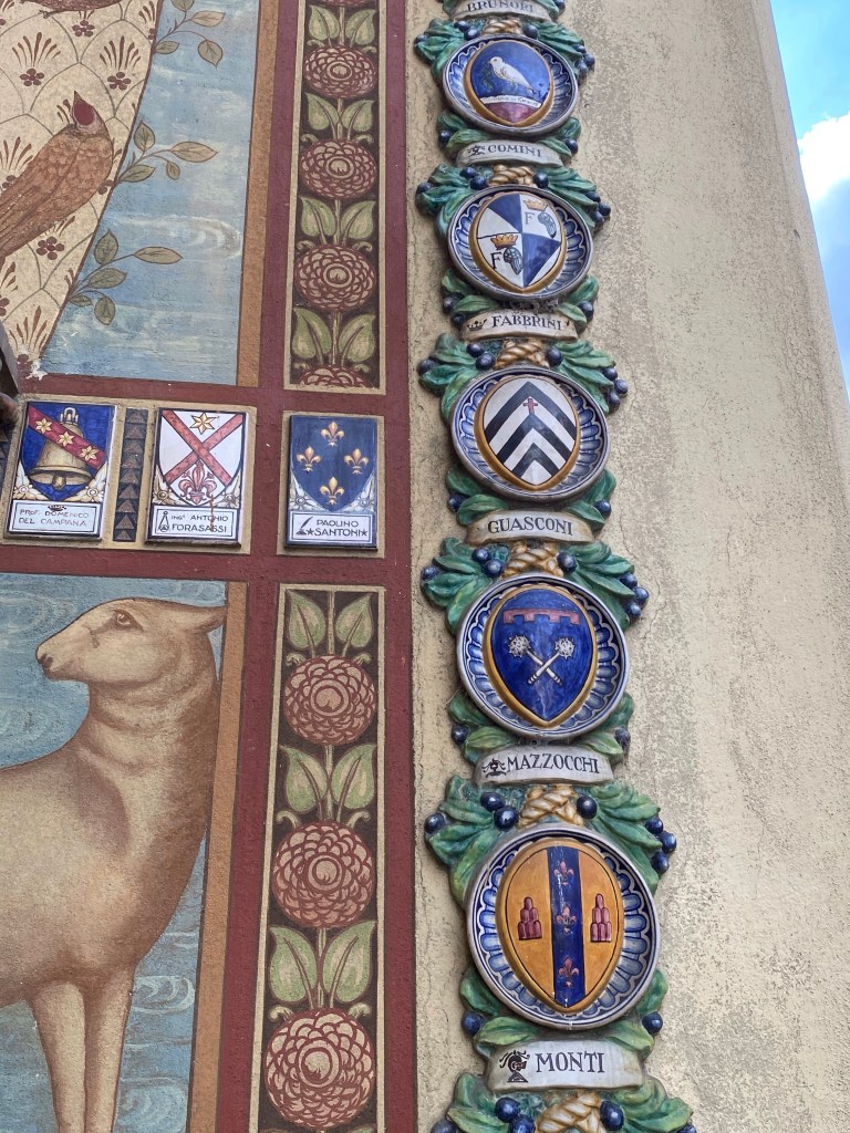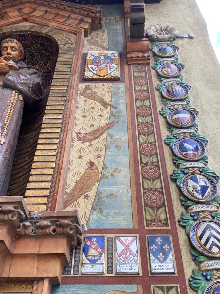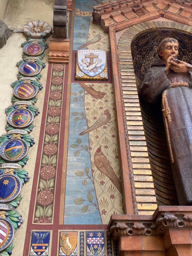 Outside the church, on the right side of the facade, sits this incredible tabernacle dedicated to St. Francis. It has coats of arms of a lot of famous Tuscan families all around it, as well as images of more faithful dogs and primitive but delightful birds listening to St. Francis preach. The ceramics in this gorgeous work of art speak to the sign I saw near the Borgo’s train station, saying that this town is the town of ceramics.