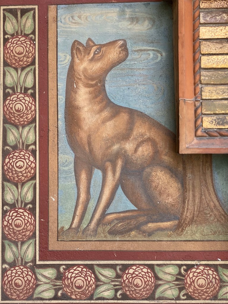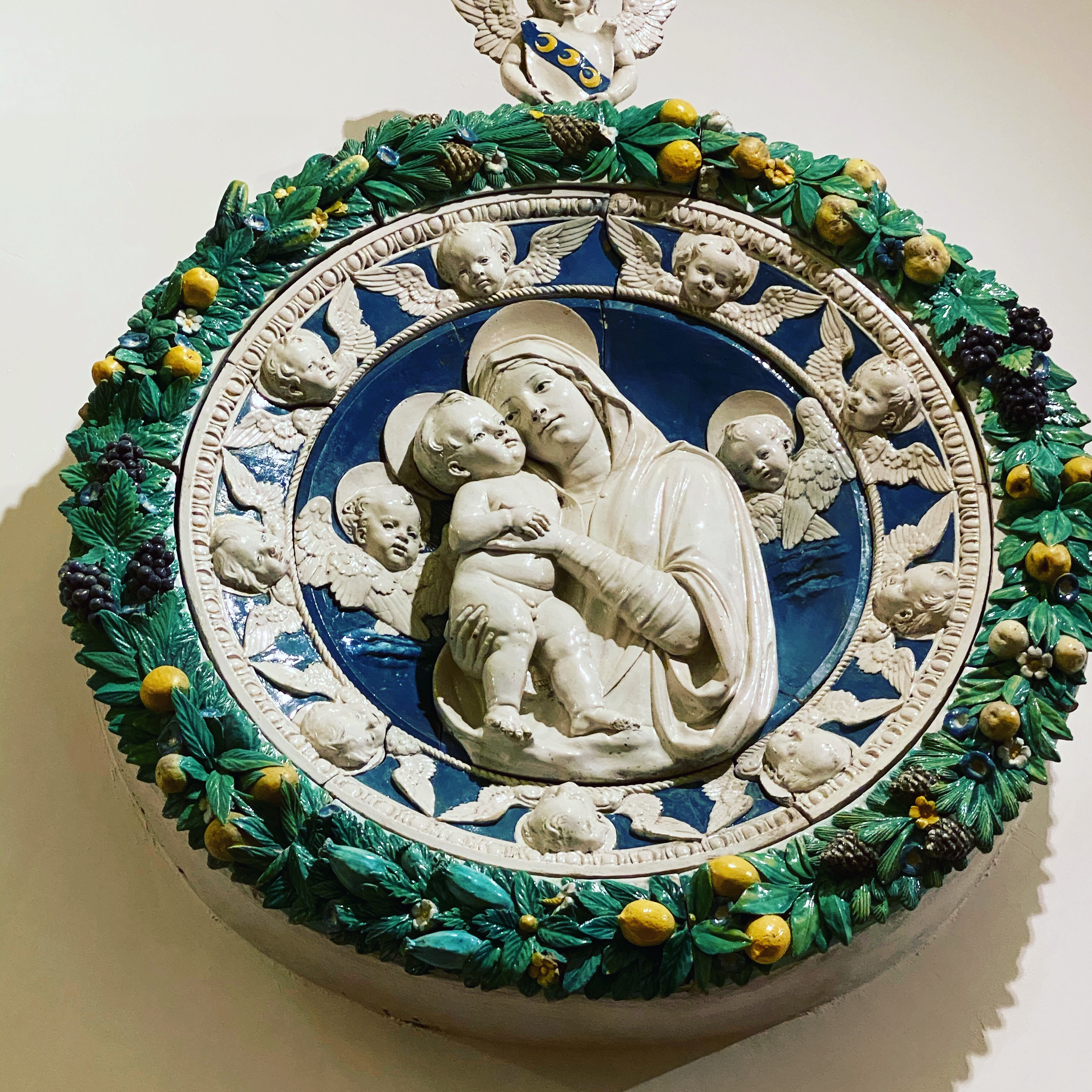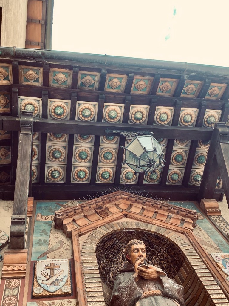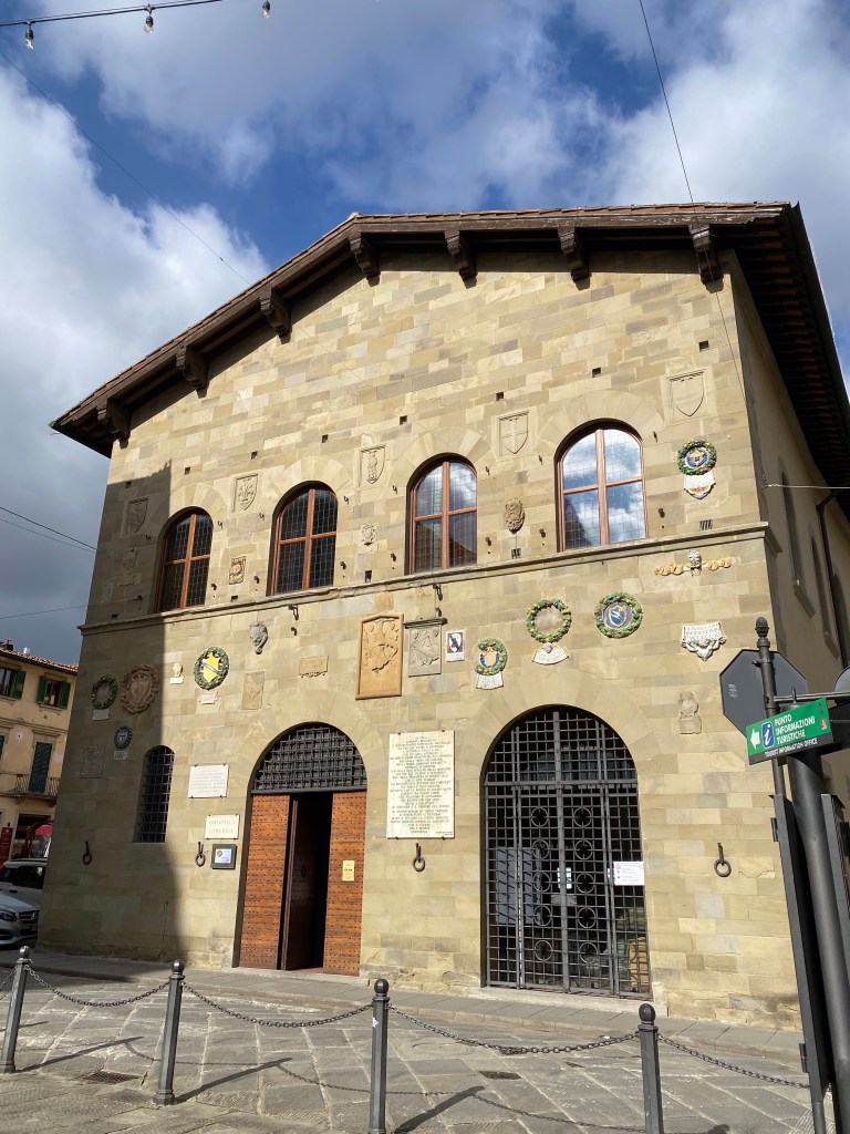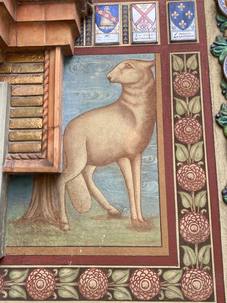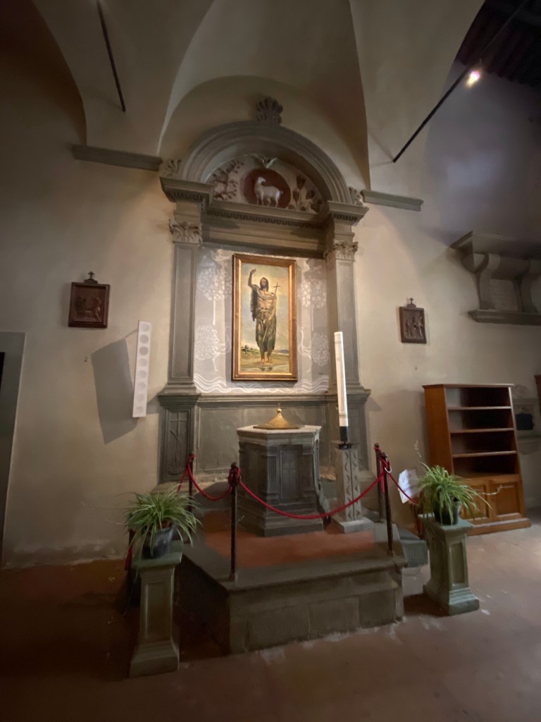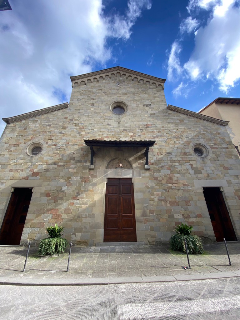 Outside the church, on the right side of the facade, sits this incredible tabernacle dedicated to St. Francis. It has coats of arms of a lot of famous Tuscan families all around it, as well as images of more faithful dogs and primitive but delightful birds listening to St. Francis preach. The ceramics in this gorgeous work of art speak to the sign I saw near the Borgo’s train station, saying that this town is the town of ceramics.