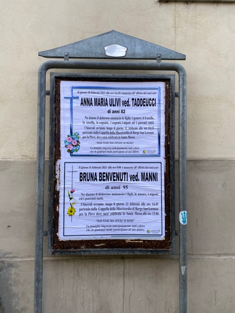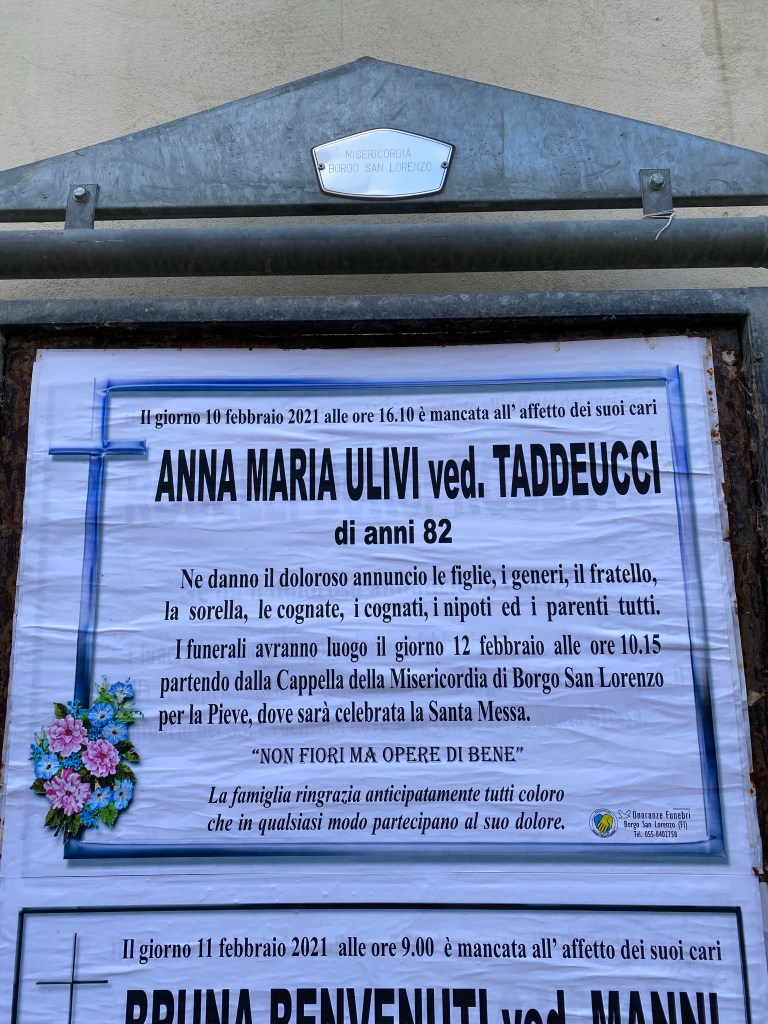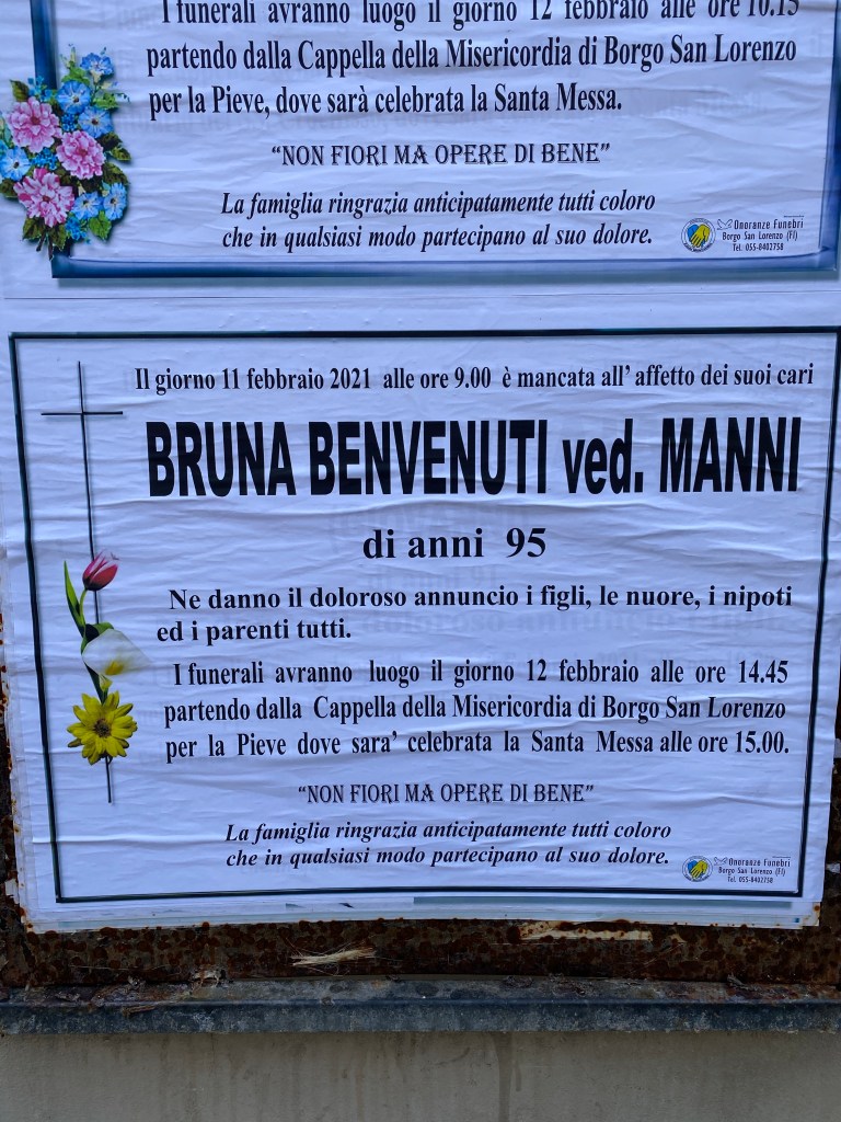 I believe these notices were more elaborate than the others I’ve seen. Both of these signs had flowers printed on them, which I’ve not seen elsewhere. Arrividerci Bruna, age 95 and Anna Maria, age 82. RIP.