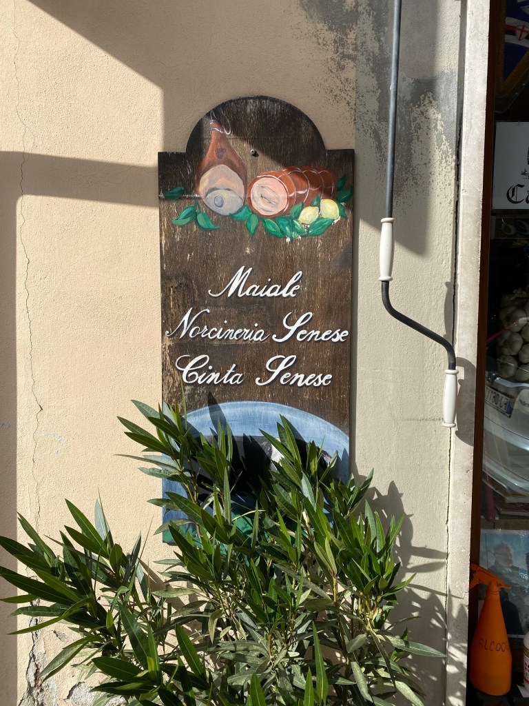 I noticed these next interesting signs in a butcher shop. “Maile, Norcineria Senese” which means, I think that they do Sienese style butchery on pork. “Cinta Senese” is a specific breed of domestically raised pigs. How many Americans choose their butcher because of the type of pork they sell? A pig is a pig is a pig to Americans. This specialization, of everything having to do with food, is one of the most fascinating aspects of Italian culture.