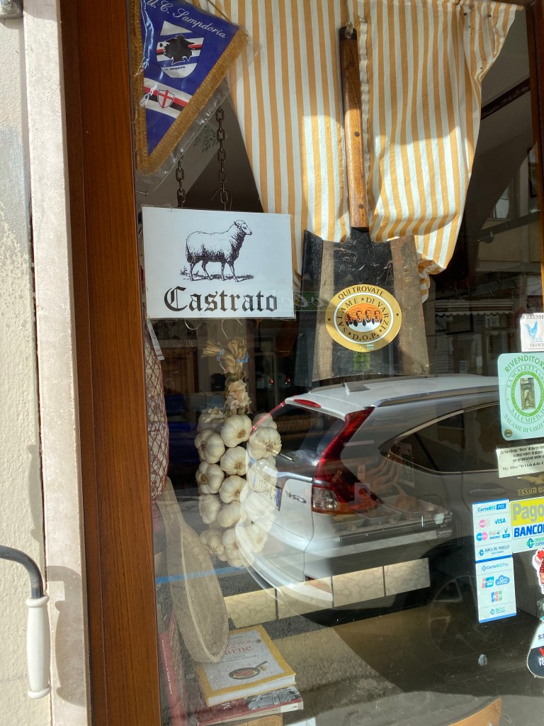 The other sign, “Castrato,” along with a picture of a sheep, tells us, I believe (? not sure), that they sell sheep meat butchered from castrated males. What detail!