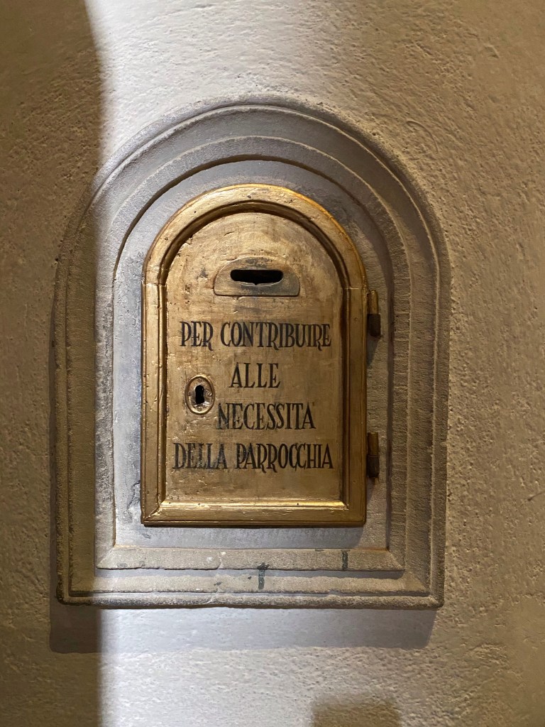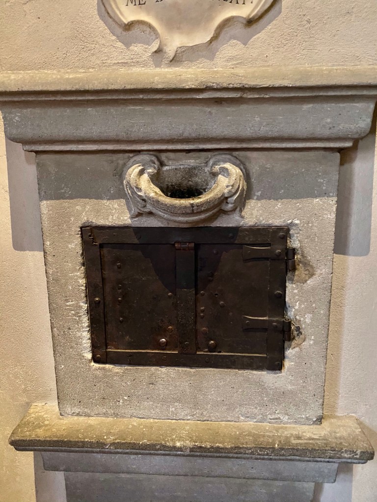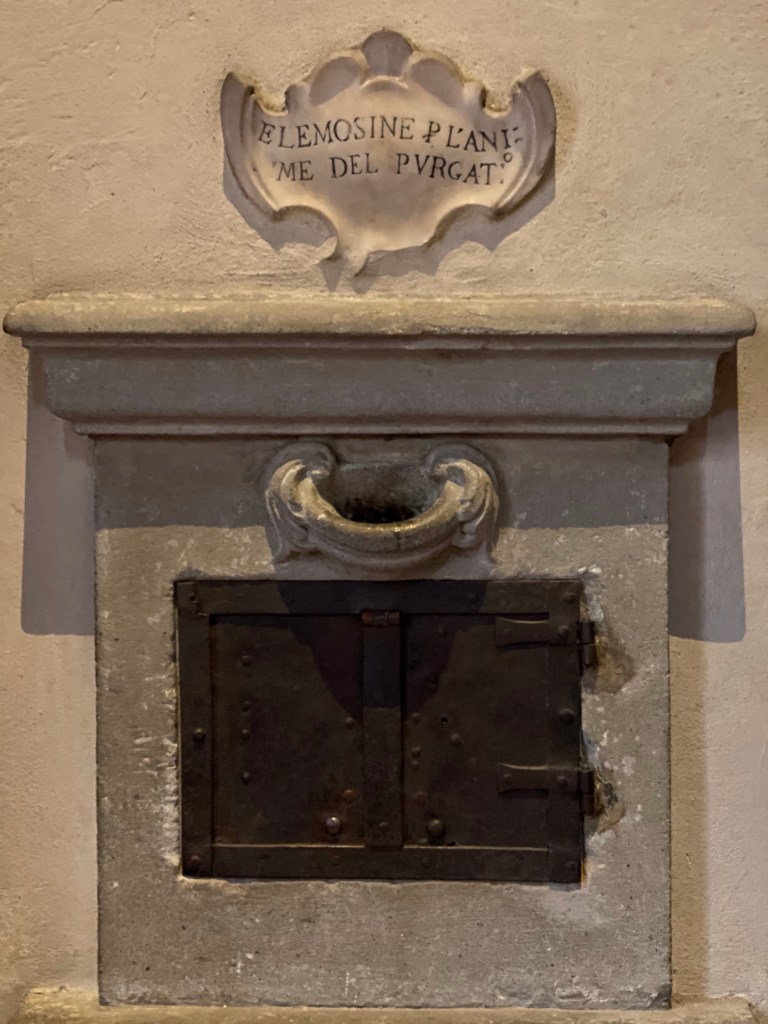 When I am in these old churches, I almost always spot something unique about them, or at least something I’ve not encountered anywhere previously. The next few pictures above and below show little boxes set in the wall in which a parishioner could insert money for a specific cause: one seems to be having to do with purgatory and the other is dedicated to necessities that the parish church needed.