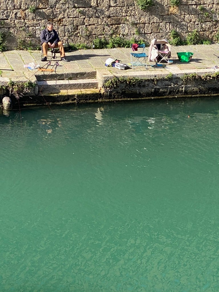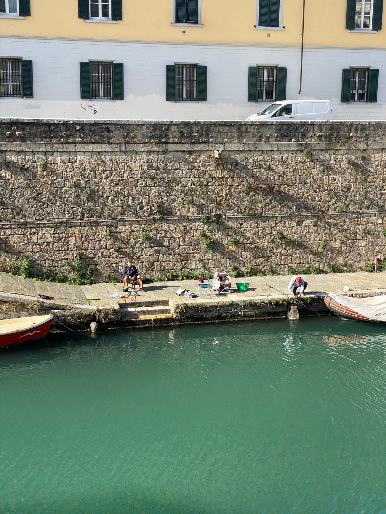 Below: some fishermen try their luck in a canal on a sunny afternoon in Livorno. The water is very clean and bright.