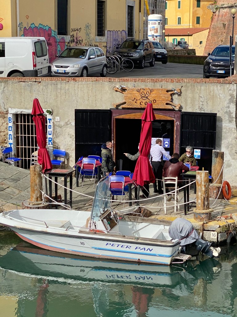 As I began to wander away from the fortifications and towards the Ligurian sea, but still well within the city, I spotted delightful scenes of daily life in Livorno. A lot of it takes place along the canal. I even spotted Peter Pan’s boat!