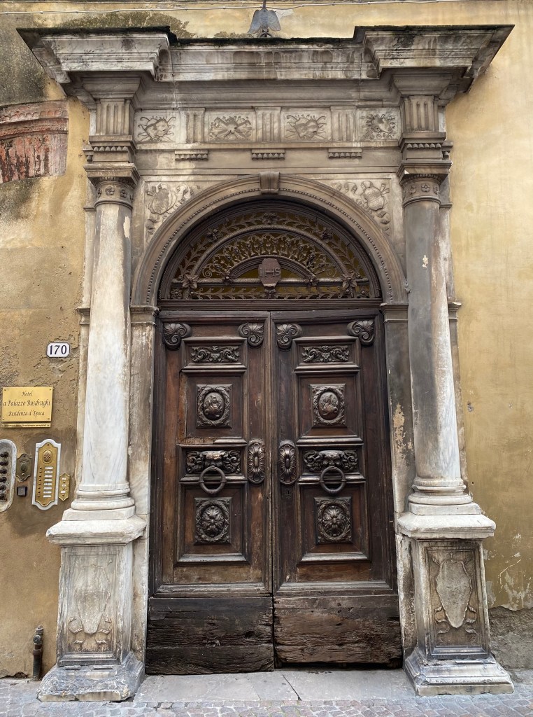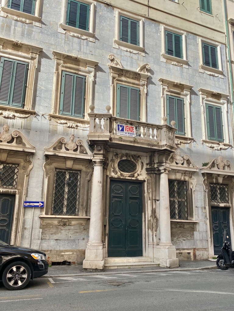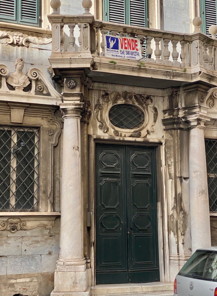 This sad but beautiful pale blue palazzo with the green shutters below tells a story, if you listen. How grand it once was. I wish I could buy it and take that “for sale” sign off its facade.