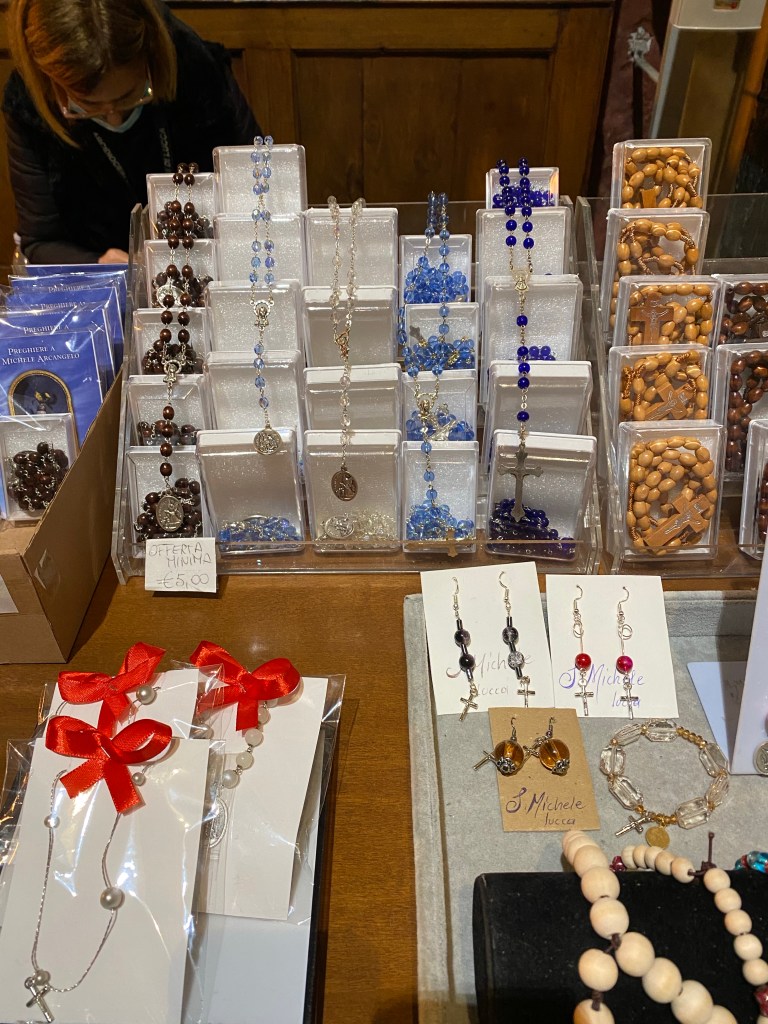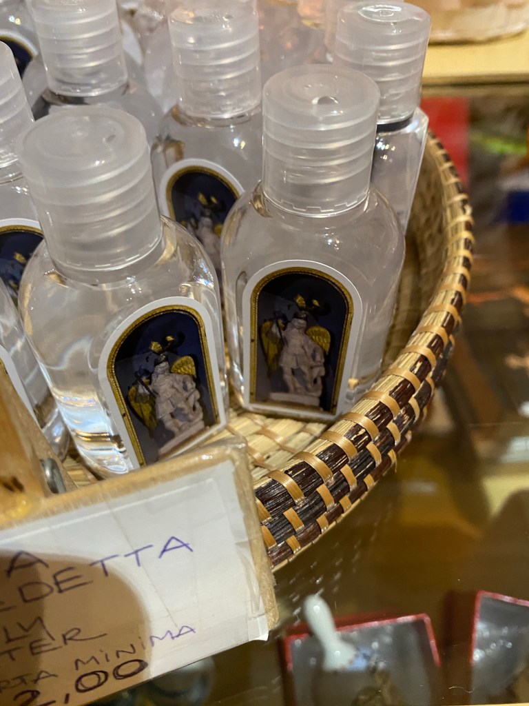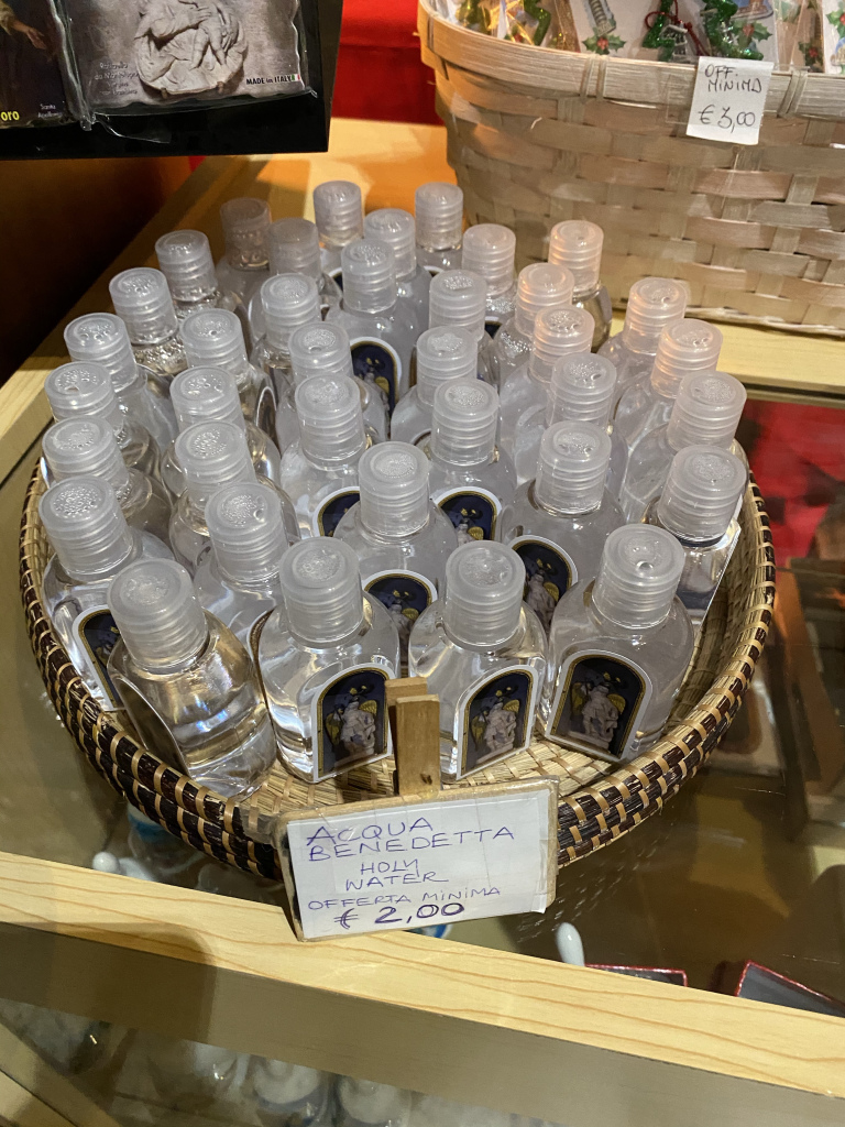 Luckily and surprisingly, for you never can tell anymore what will be open when (thanks for nothing Covid), the church was open and I had a lovely tour around the interior. Many things caught my eye, including these bottles of holy water, for 2 Euro per bottle, just right for taking on an airplane. Ha ha.