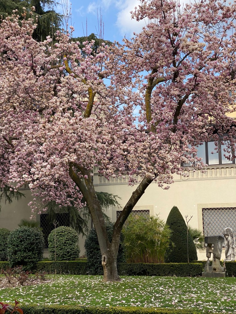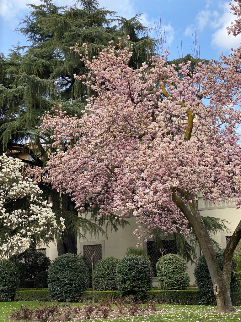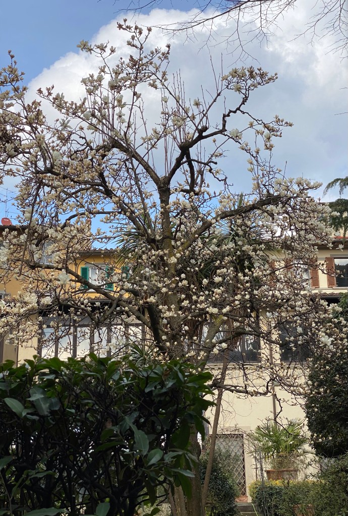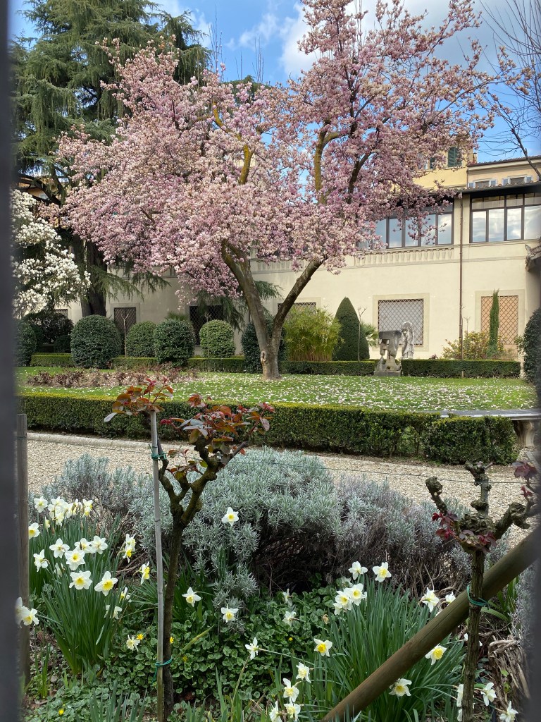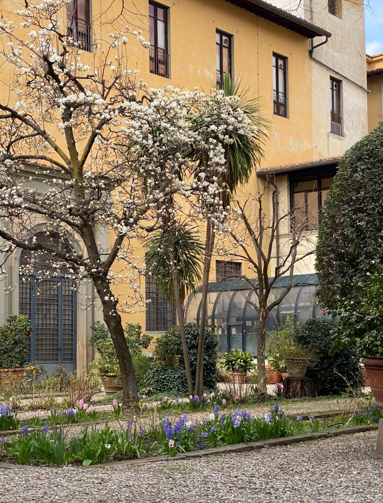 The garden behind the Archaeological Museum frustrates me in particular this week. Look at this early beautiful springtime tableau! These are the only daffodils and other spring-blooming bulbs I’ve seen flowering in Florence and they, along with the pink and the white magnolia trees, are behind bars. Florence doesn’t have (m)any gardens planted with spring bulbs as you would see in the UK or the USA.