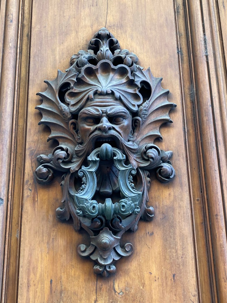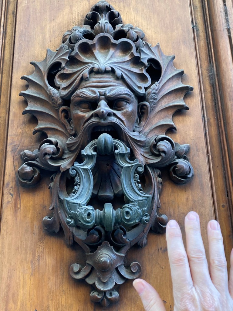 And, below, what is possibly the most impressive door knock in all of Florence. It’s complicated, it’s fantastical, and it’s huge. I added a 2nd photo with my hand, for scale. This poor man has been holding the movable part of the knock for centuries with his tongue!