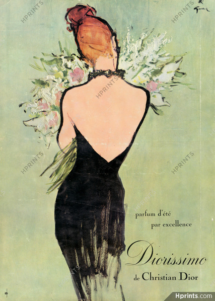 “Dior and Roudnitska met in 1955 and made their dream come true in 1956- Diorissimo was created! The perfume was represented by an illustration by René Gruau. According to Christian Dior, Diorissimo is the perfume of his spirit, or, ‘the scented expression of his soul.’ “