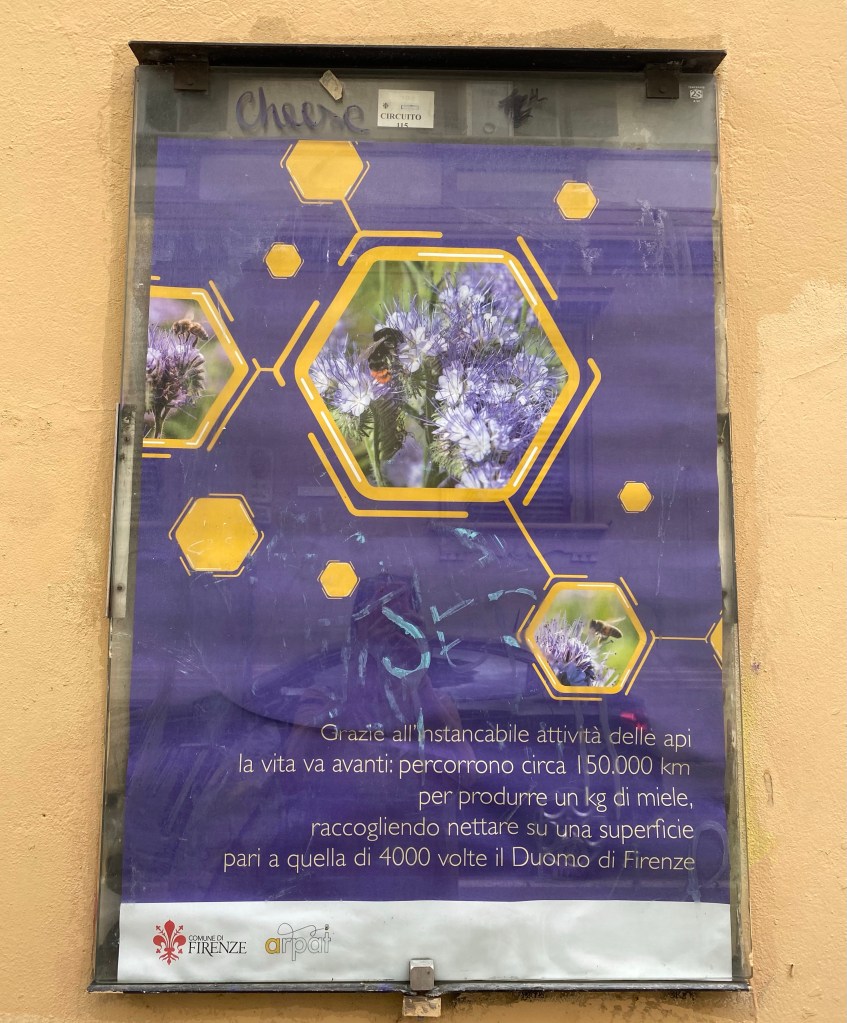 I love reading the posters that are found around Florence. They are both art and public service messages. Although my photo isn’t the best, I hope you can see that this poster celebrates the bee!
