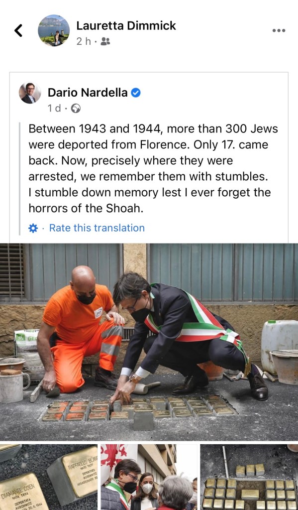This week our mayor, Dario Nardella, posted a commemoration of the Jews who were deported during WWII. It is a tragic part of the city’s (and the world’s) history. Never forget.