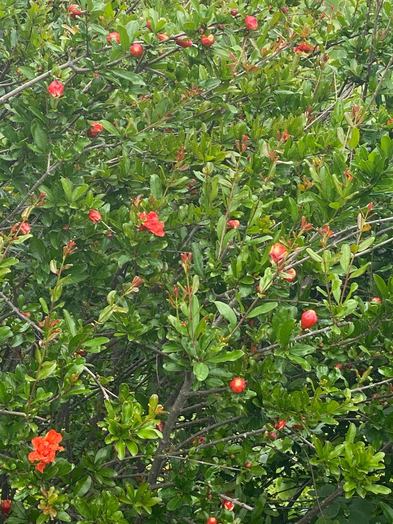 The reddish/orange blooms below caught my eye. They seemed to be the color of flowering Japanese quince, but I knew it was too late in the spring for those blossoms. I opened by handy dandy plant app to discover what they actually were, and they are the blooms of pomegranate. This shrub, or tree, is still pretty new to me, so I am still learning. What pretty blossoms!