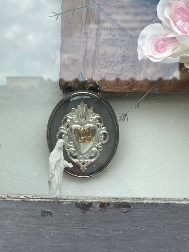 On the lower left side, there is a symbol of a heart, fronted by a small figure of the Virgin Mary. I find these tableaus to be very intriguing.
