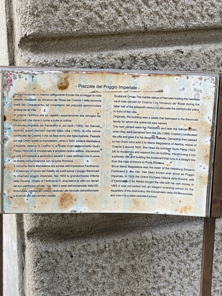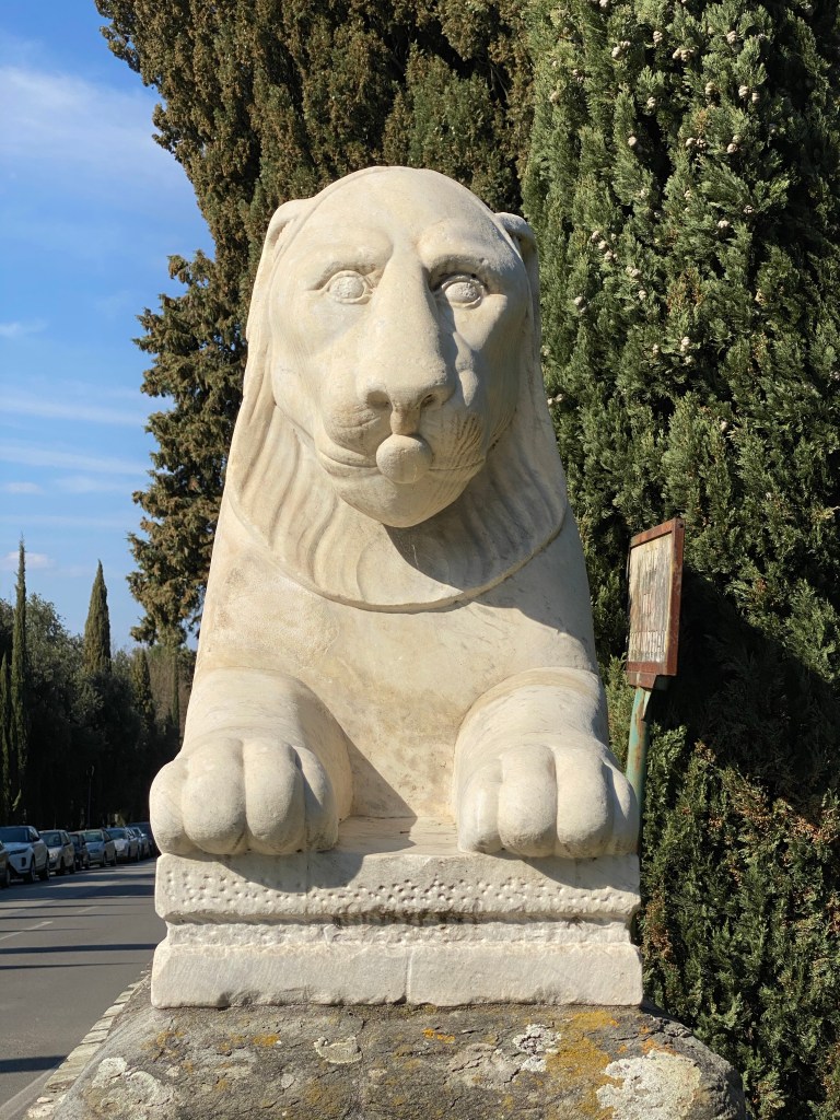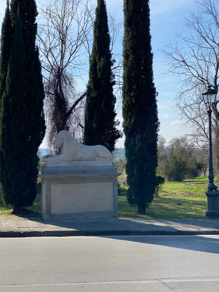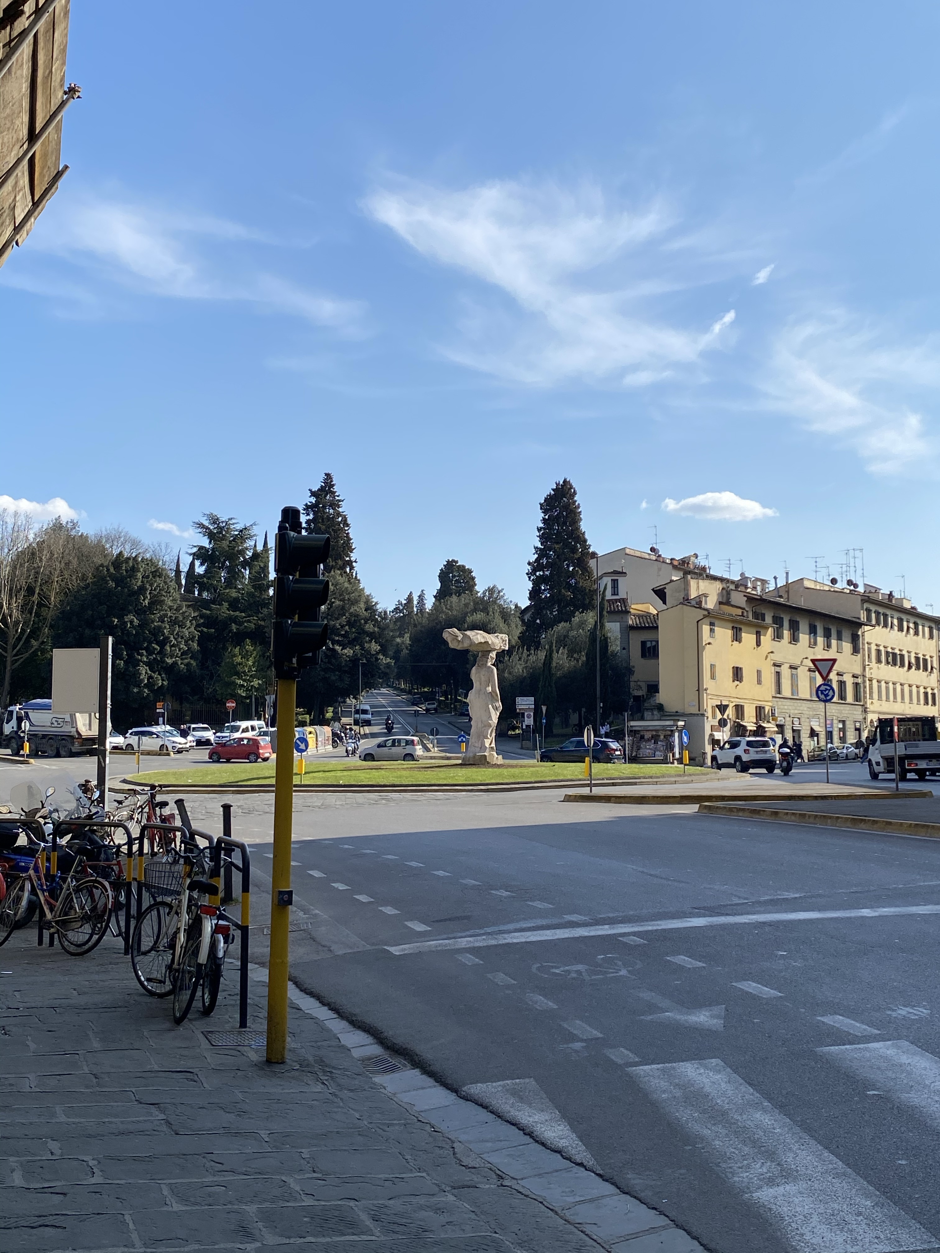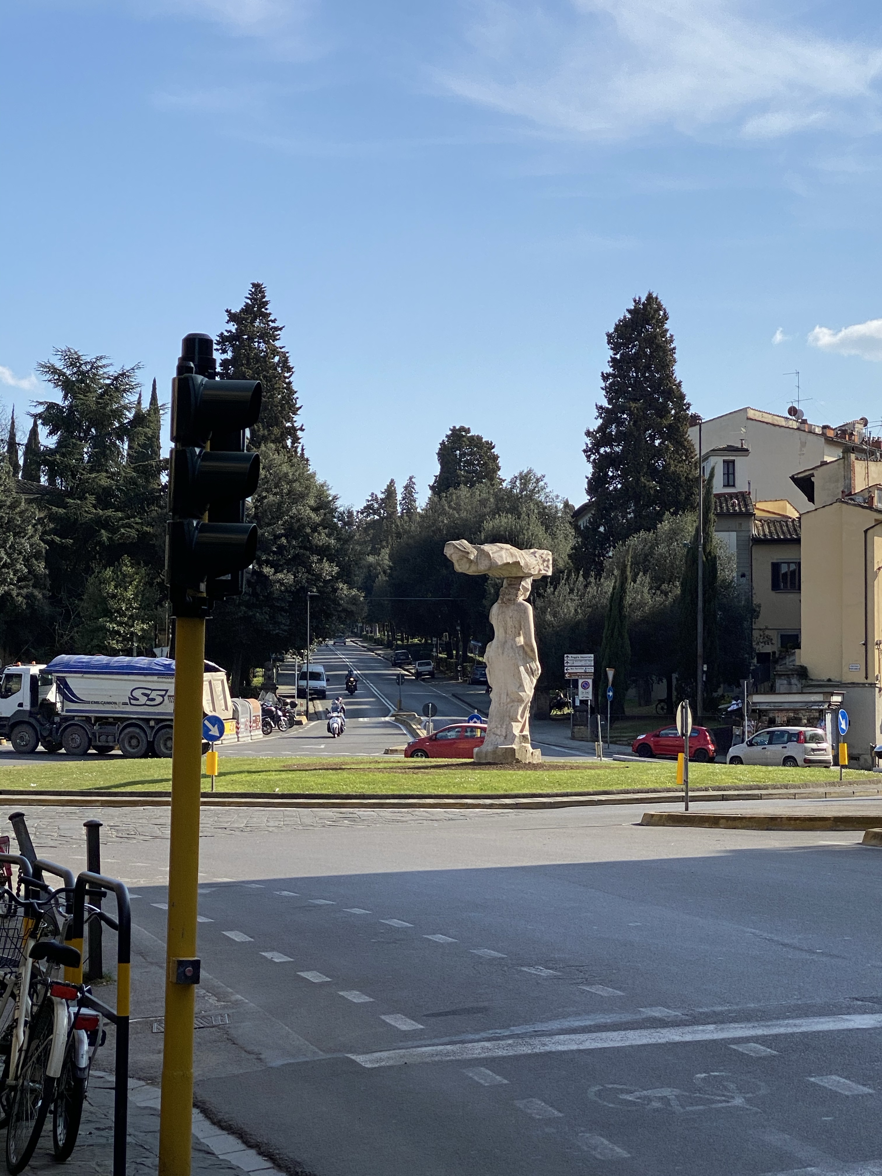 And then, at the foot of the Viale, we run into the Porta Romana entrance to the historic center of Florence. If you look to the left of the statue, just behind her, you will see the Viale starting its ascent to the Villa. The statue is by Michelangelo Pistoletto, entitled Pietro-Front or “turnabout” from 1984.