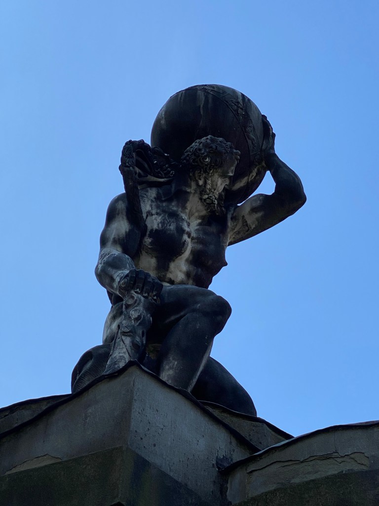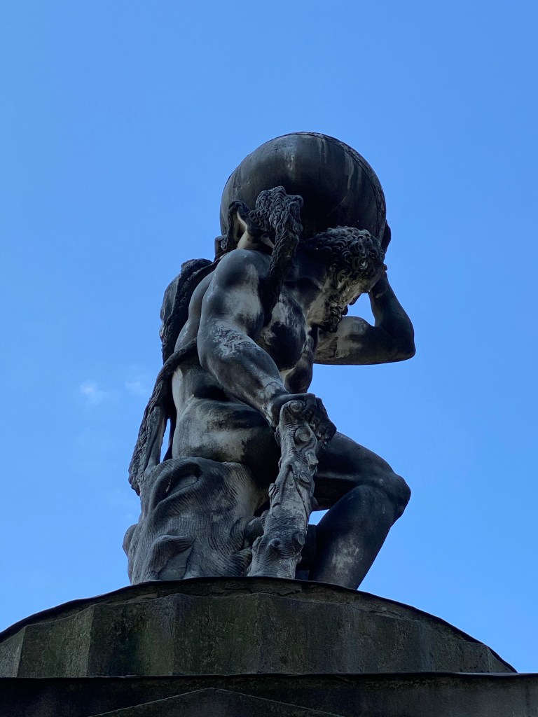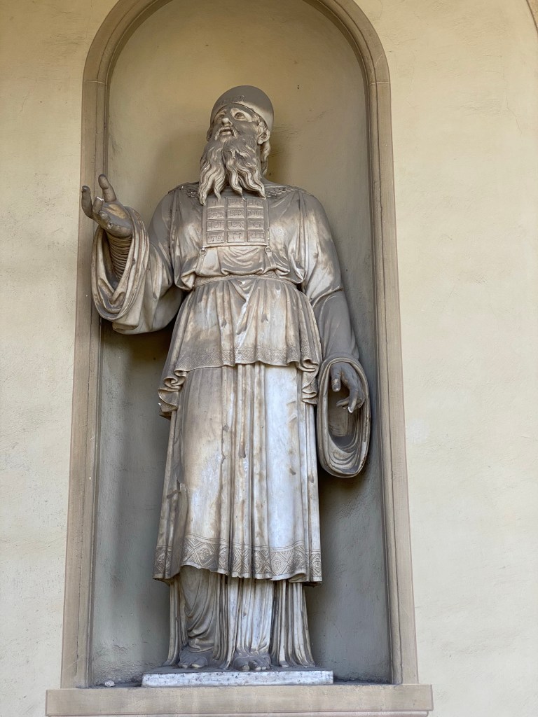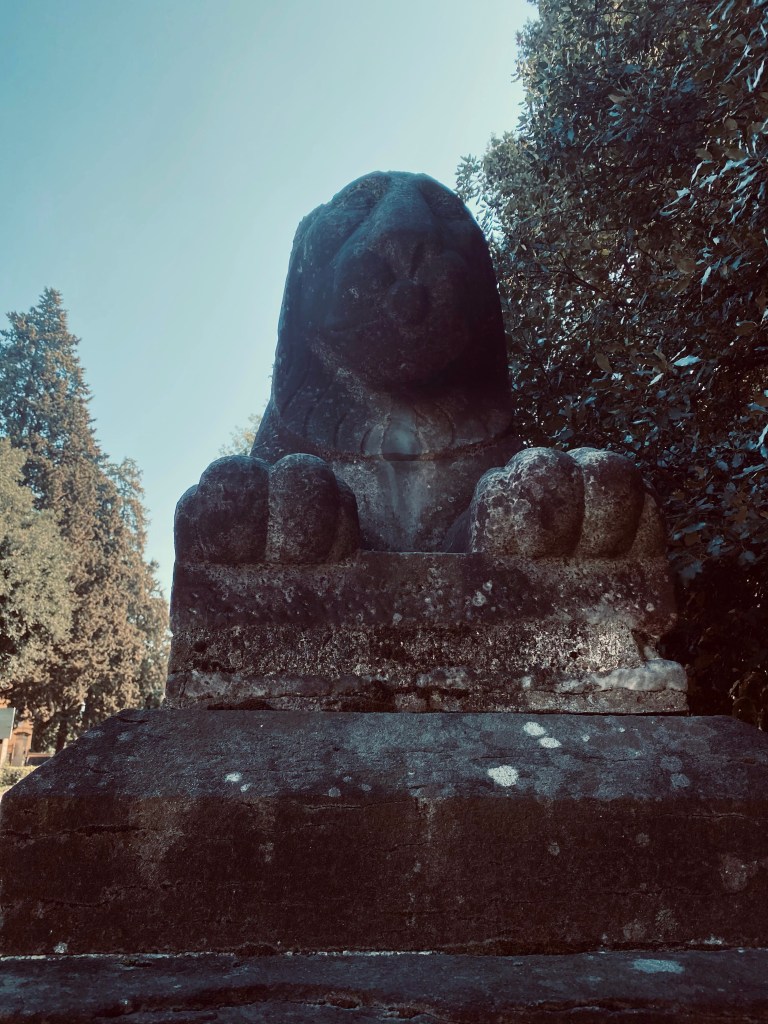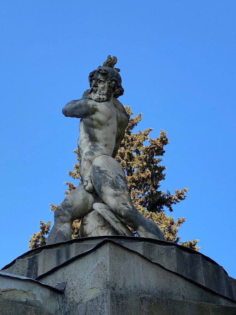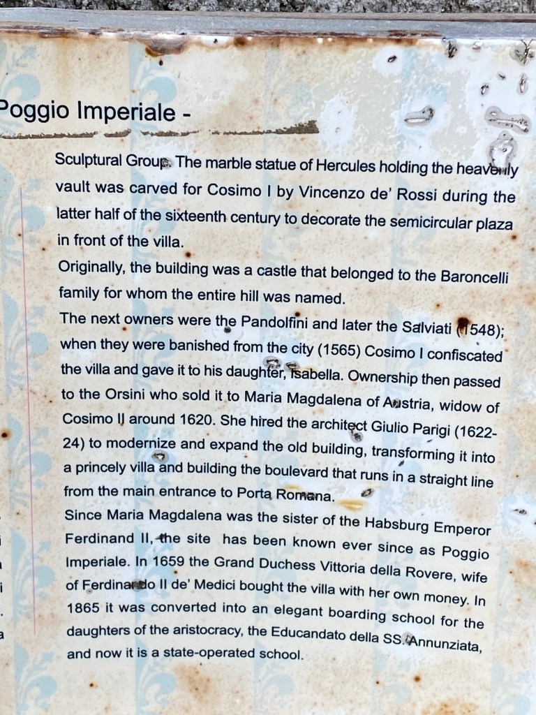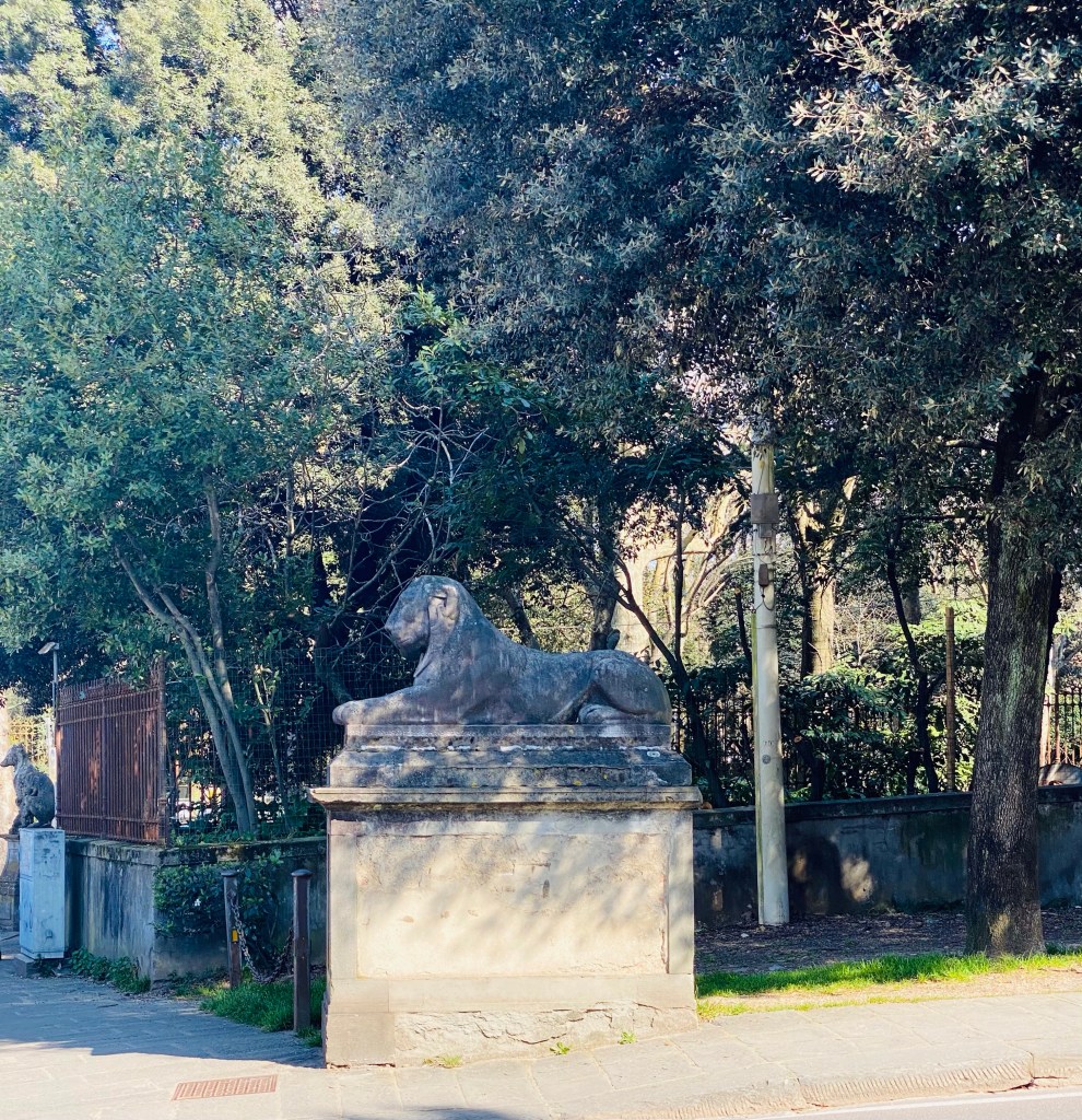 And then, at the foot of the Viale, we run into the Porta Romana entrance to the historic center of Florence. If you look to the left of the statue, just behind her, you will see the Viale starting its ascent to the Villa. The statue is by Michelangelo Pistoletto, entitled Pietro-Front or “turnabout” from 1984.