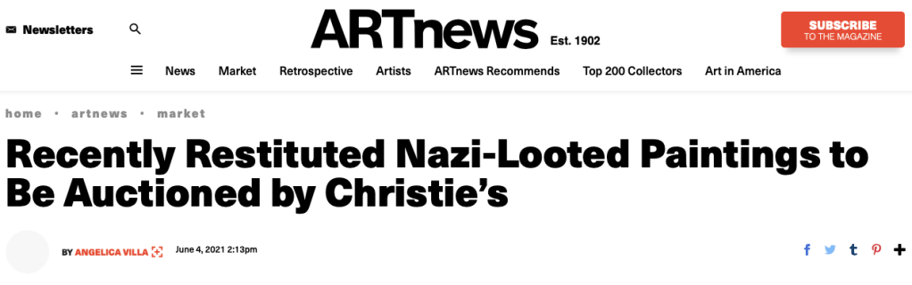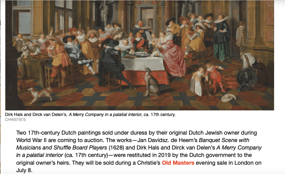 Restituted Nazi-looted paintings now up for sale at Christie’s June 9, 2021 / get back, laurettadimmick Recently Restituted Nazi-Looted Paintings to Be Auctioned by Christie’s https://www.artnews.com/art-news/market/christies-old-masters-july-2021-auction-restituted-dutch-paintings-1234594834/ Share this: Share on X (Opens in new window) X Share on Facebook (Opens in new window) Facebook More Share on Reddit (Opens in new window) Reddit Share on Tumblr (Opens in new window) Tumblr Share on Pinterest (Opens in new window) Pinterest Print (Opens in new window) Print Share on LinkedIn (Opens in new window) LinkedIn Email a link to a friend (Opens in new window) Email Like Loading...
