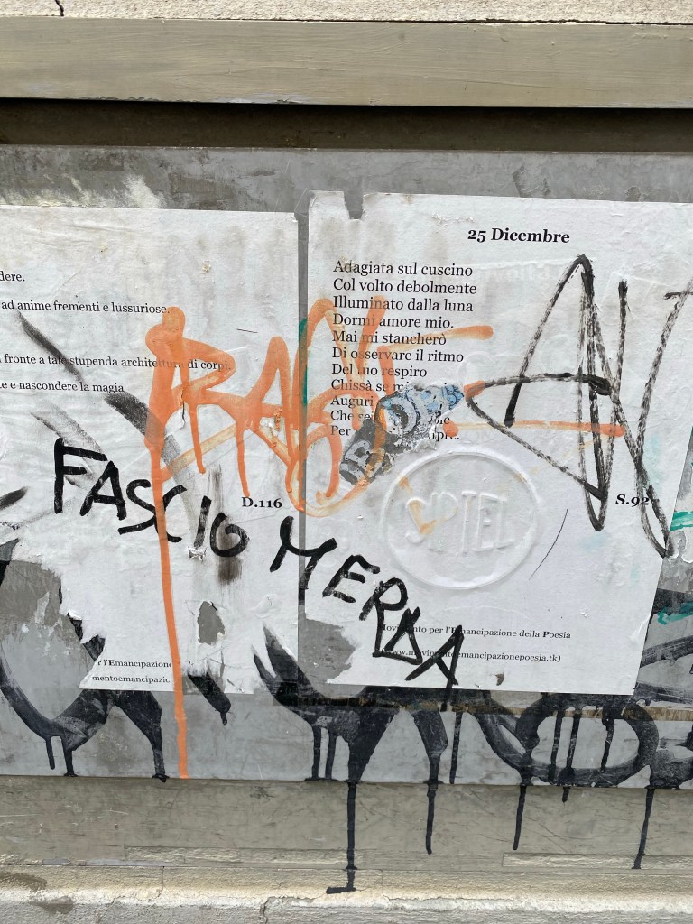 Even if some naysayer feels free to put graffiti on top of the poetry, saying “Fascist shit.” As the Wicked Witch of the West was fond of saying, “what a world, what a world.”
