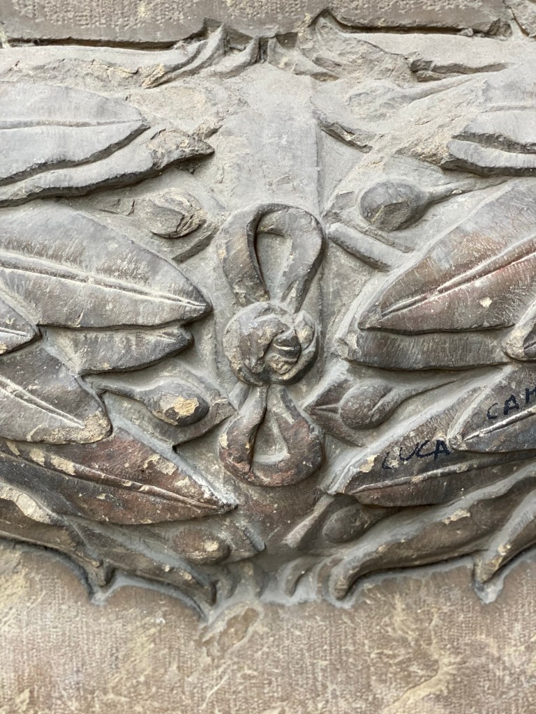 Near the corner at the top, another very ornate marble coat of arms is clearly visible, with two female figures holding up the shield with the family arms ; this sculpture can be traced back to Caccini
