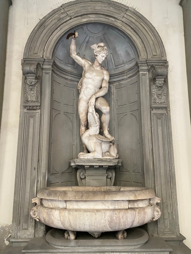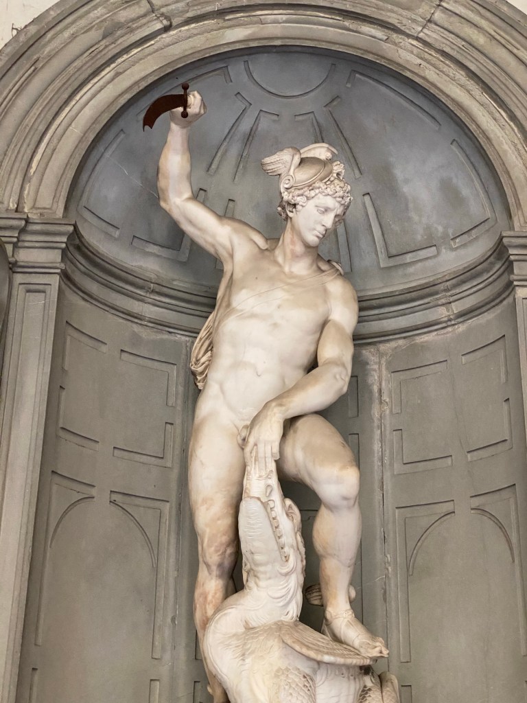 In a niche, prospectively built in front of the main entrance, there is a 16th-century statue, Perseus killing the dragon, by the sculptor Giovanni Battista Lorenzi. In the loggia on the right there is a bust of Paolo Mantegazza, founder of the Museum of Anthropology, created by Ettore Ximenes, a marble plaque dedicated to Nello Puccioni and a medallion in memory of Aldobrandino Mochi. Both Puccioni and Mochi enriched the museum’s collections with their donations.