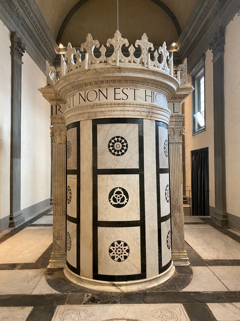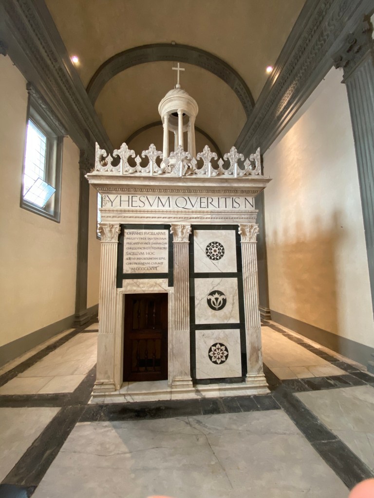 The next photo shows the inscription on the tomb. Roughly translated, it says:”Giovanni di Paolo Rucellai, in order that his salvation might be prayed for from where, through Christ, the resurrection of all was achieved, had this temple built in the shape of the tomb in Jerusalem [in] 1467″.