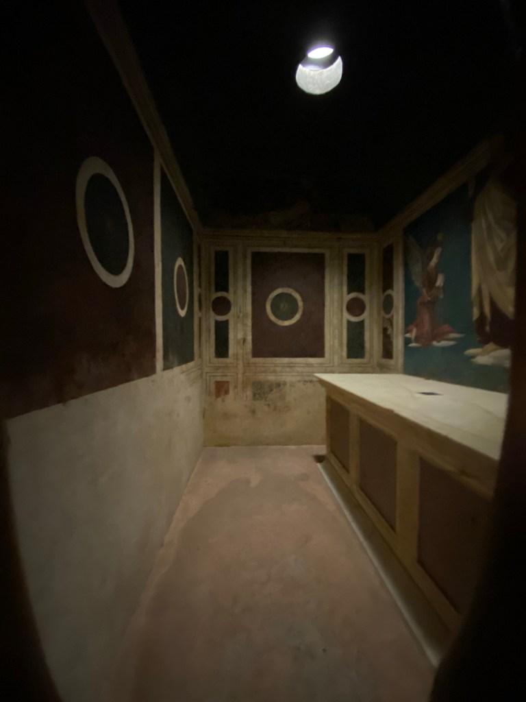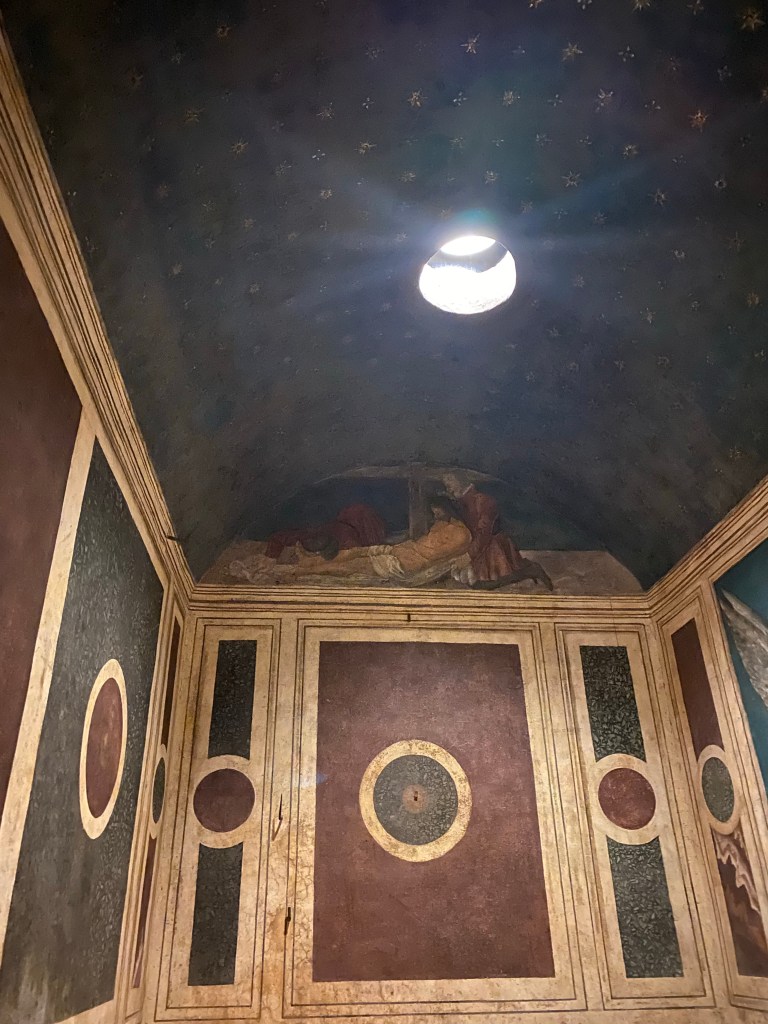 What I hadn’t known until yesterday when I visited this marvel for the first time ever (why did it take me so long? it’s been on my list of things to see for decades!) is that the wooden door is actually pierced with openings and so it is possible to see inside the tomb. The inner walls and vault of the sepulchre are entirely frescoed, work that one author has attributed to Giovanni da Piamonte.
