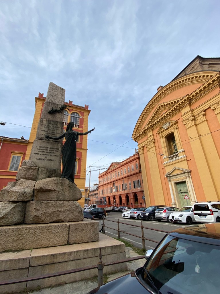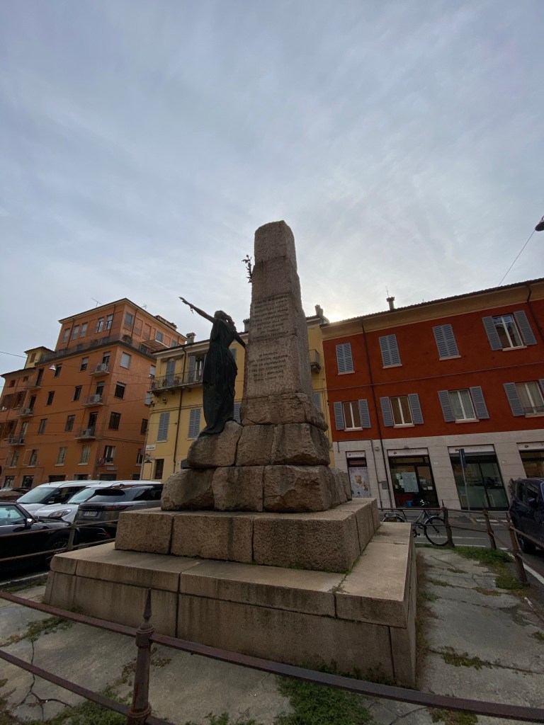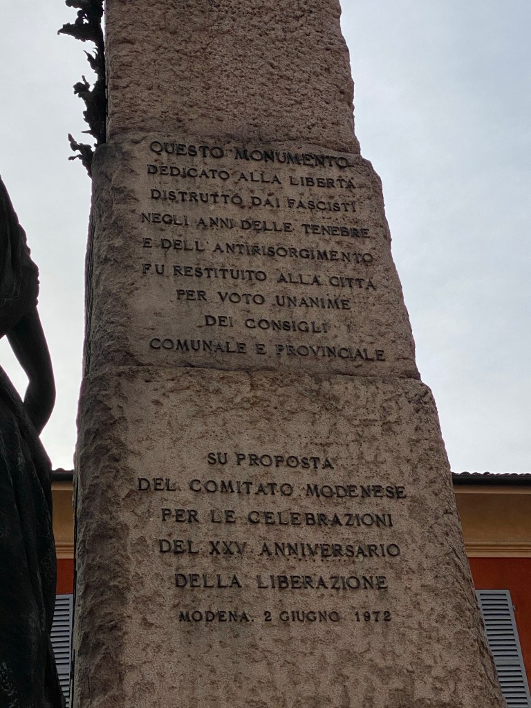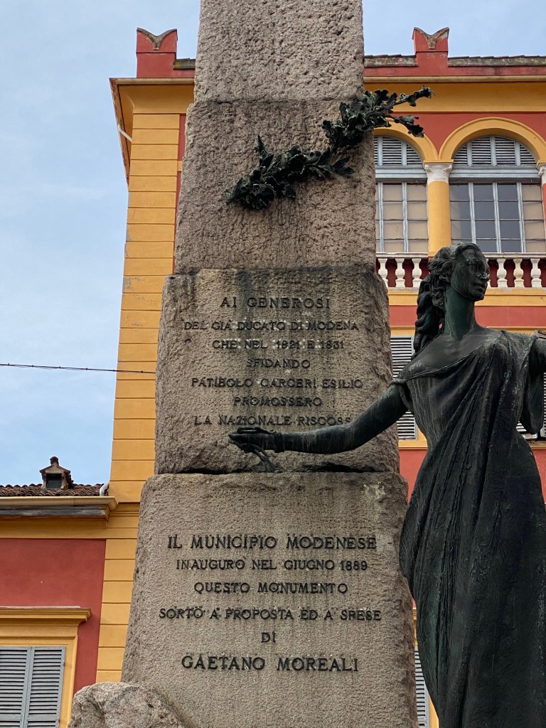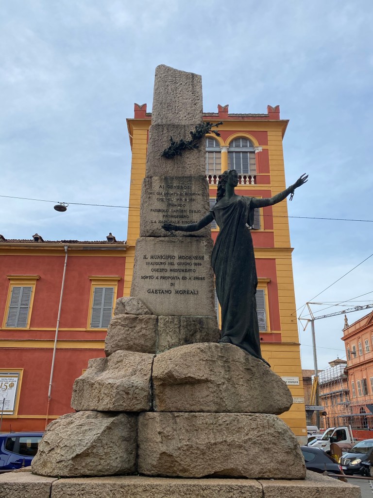 Barberini’s statue of “Italia” was removed in 1942 by the Fascists and melted down for war time use. The replacement, which we see today, is an attenuated figure of a young woman by the Modenese sculptor Marino Quartieri. This statue dates to 1972, when the renewed monument was inaugurated.