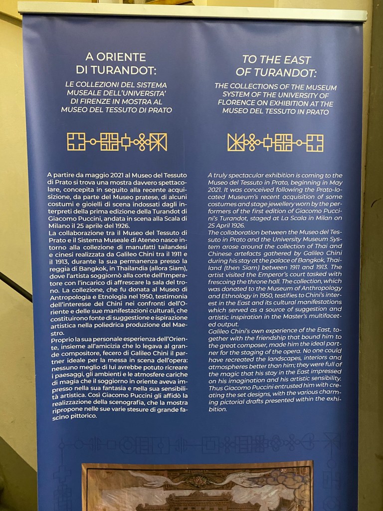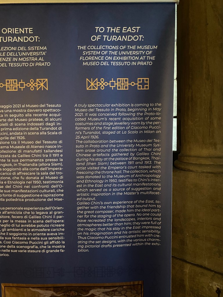 The exhibition is curated by Daniela Degl’Innocenti (Prato Textile Museum) and Monica Zavattaro (Museum of Anthropology and Ethnology of the University of Florence). Other public and private bodies collaborated and contributed to the wealth of the exhibits, including the Ricordi Historical Archives, the Giacomo Puccini Foundation, the Uffizi, and the Teatro alla Scala Museum.