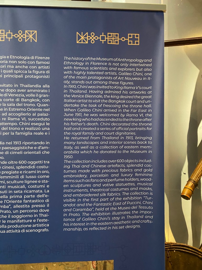 The University Museum System (SMA), co-organizer of the exhibition, participates with 120 objects from the collection of over 600 oriental memorabilia brought back by Chini on his return trip from Siam (now Thailand) in 1913. Donated in 1950 to the Museum of Anthropology in Florence, by Chini himself, these include precious textiles, dance accessories, theatrical masks and costumes, painted porcelain objects, musical instruments, sculptures, weapons, and custom artifacts of Thai and Chinese production.