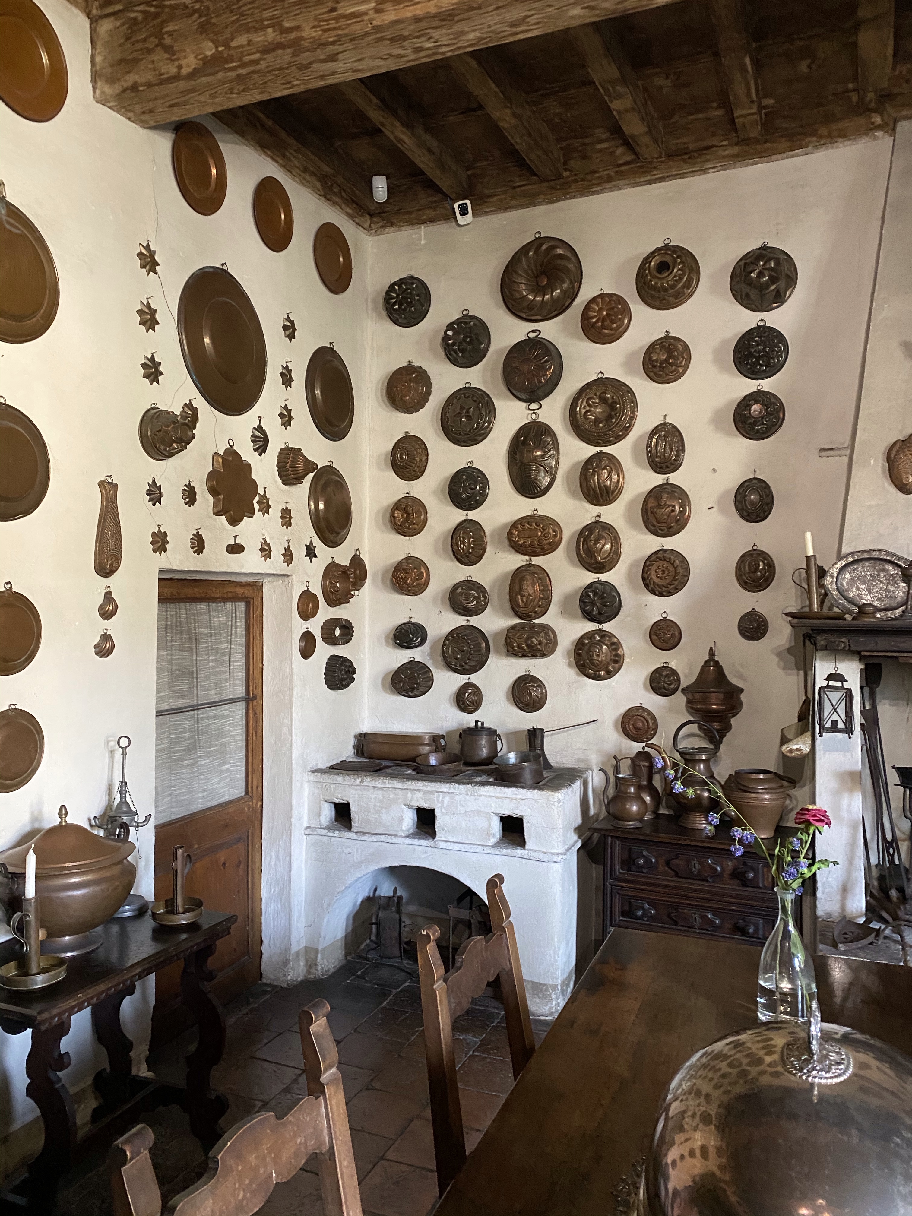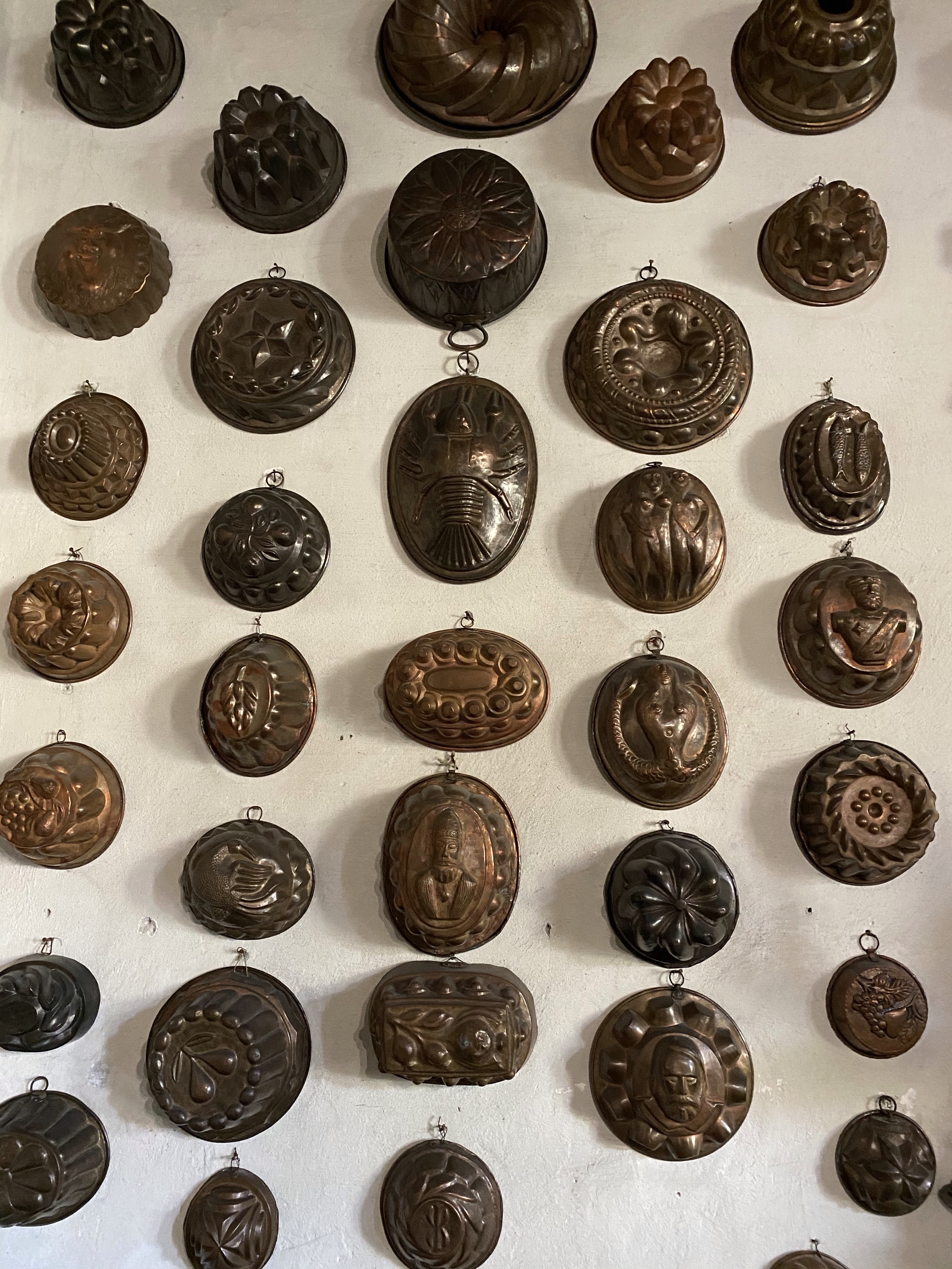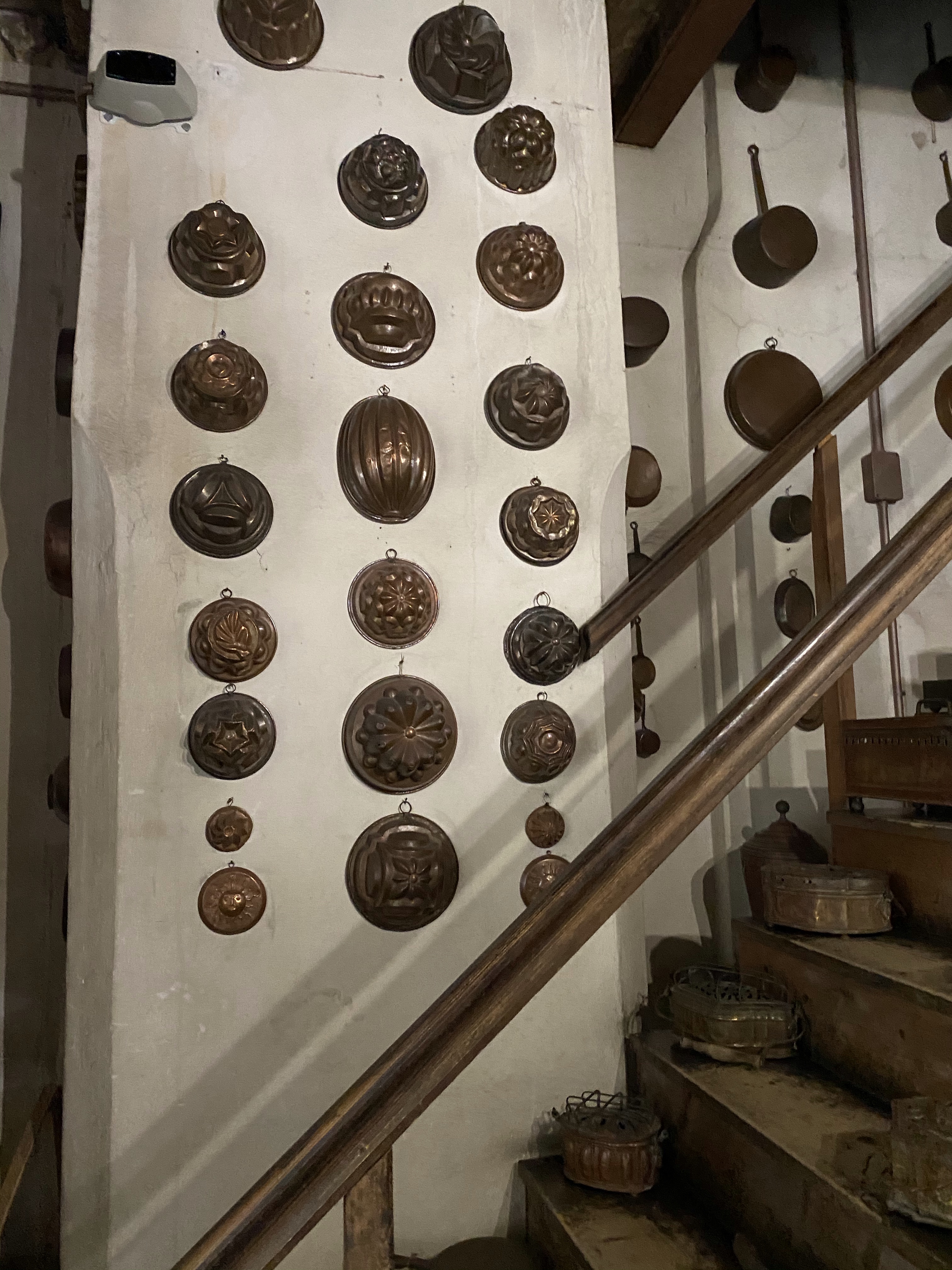 Above the stove a series of molds for figured cakes and puddings, some of which date back to the second half of the 17th century.