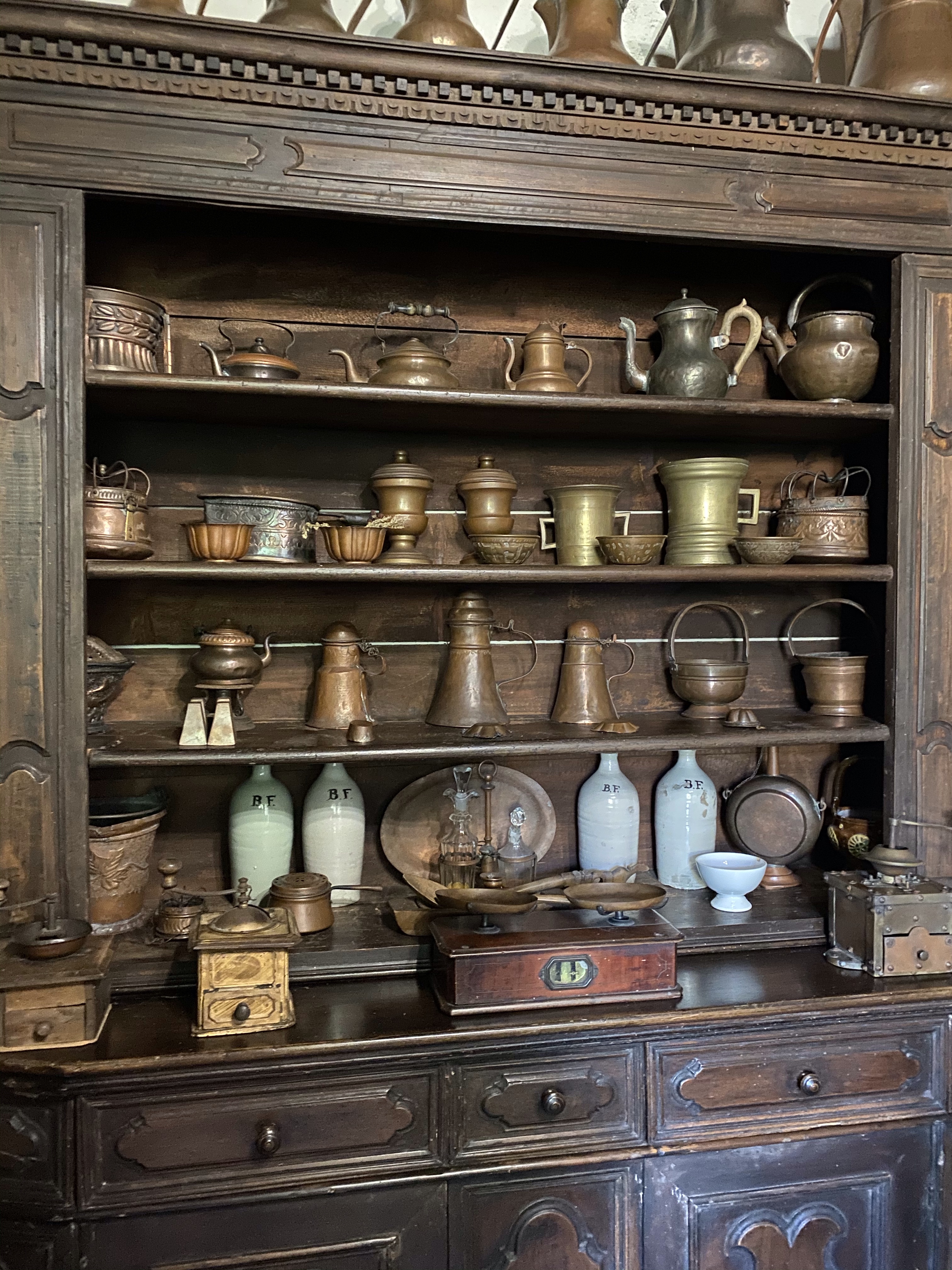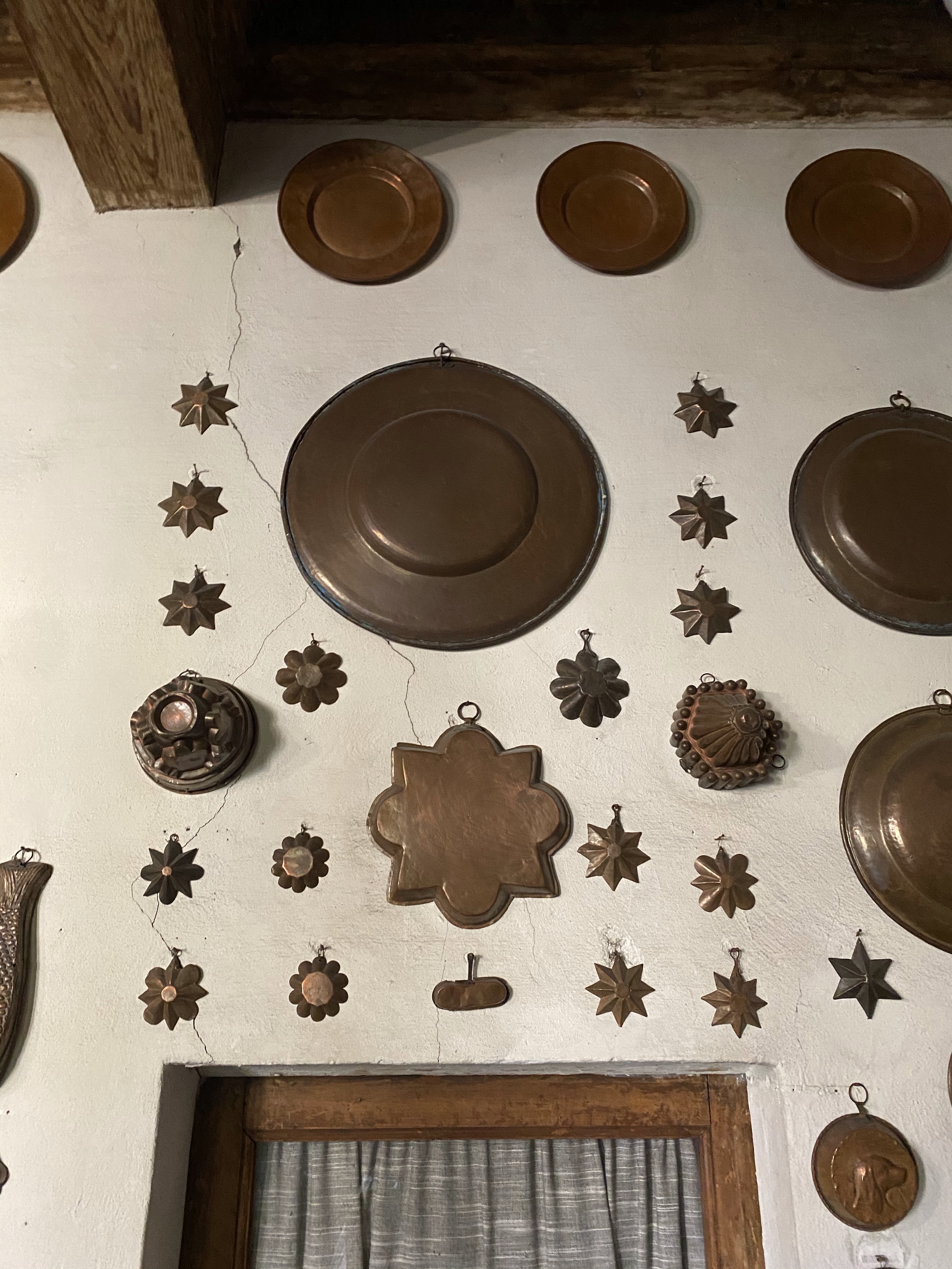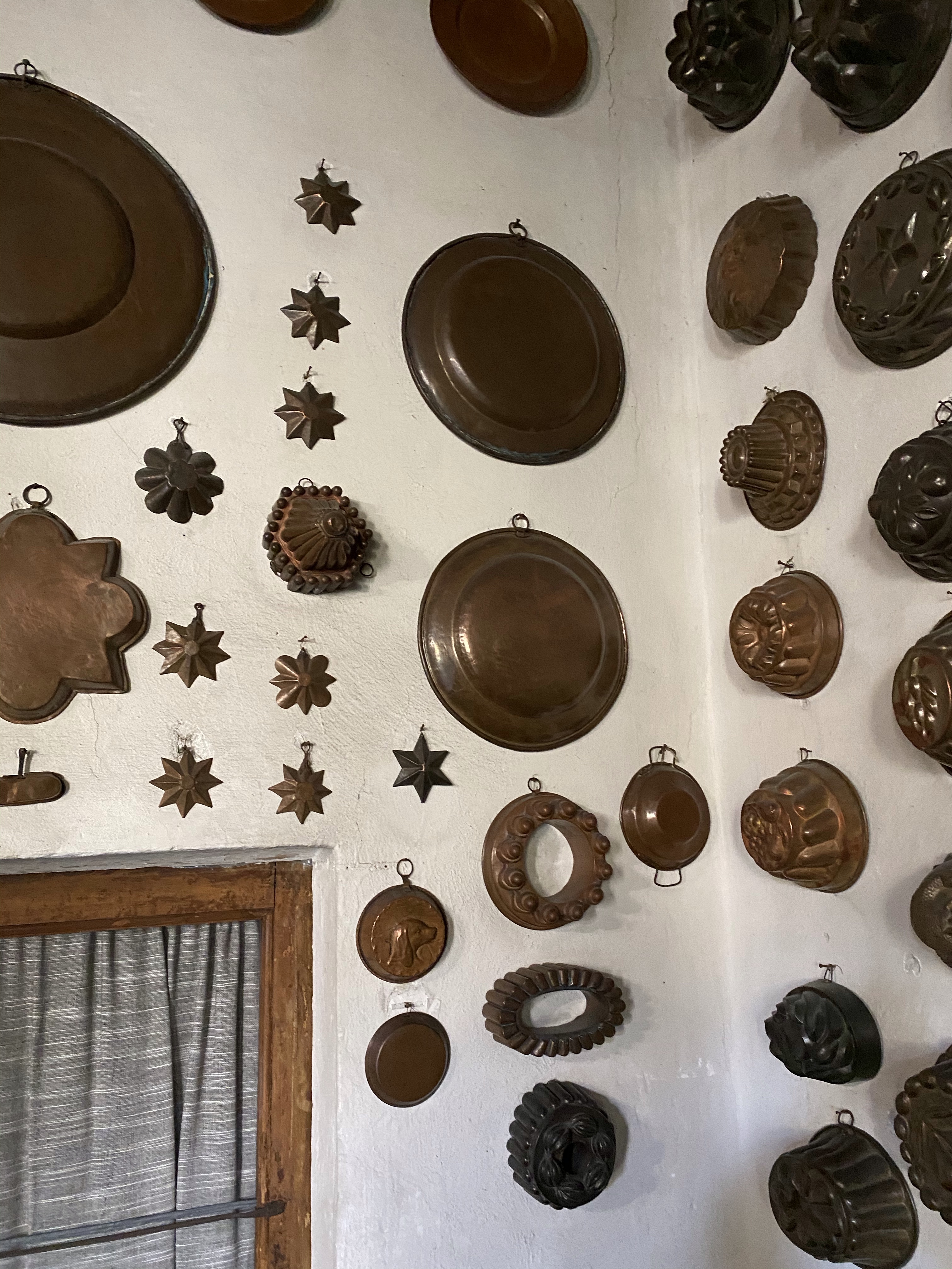 Above the stove a series of molds for figured cakes and puddings, some of which date back to the second half of the 17th century.