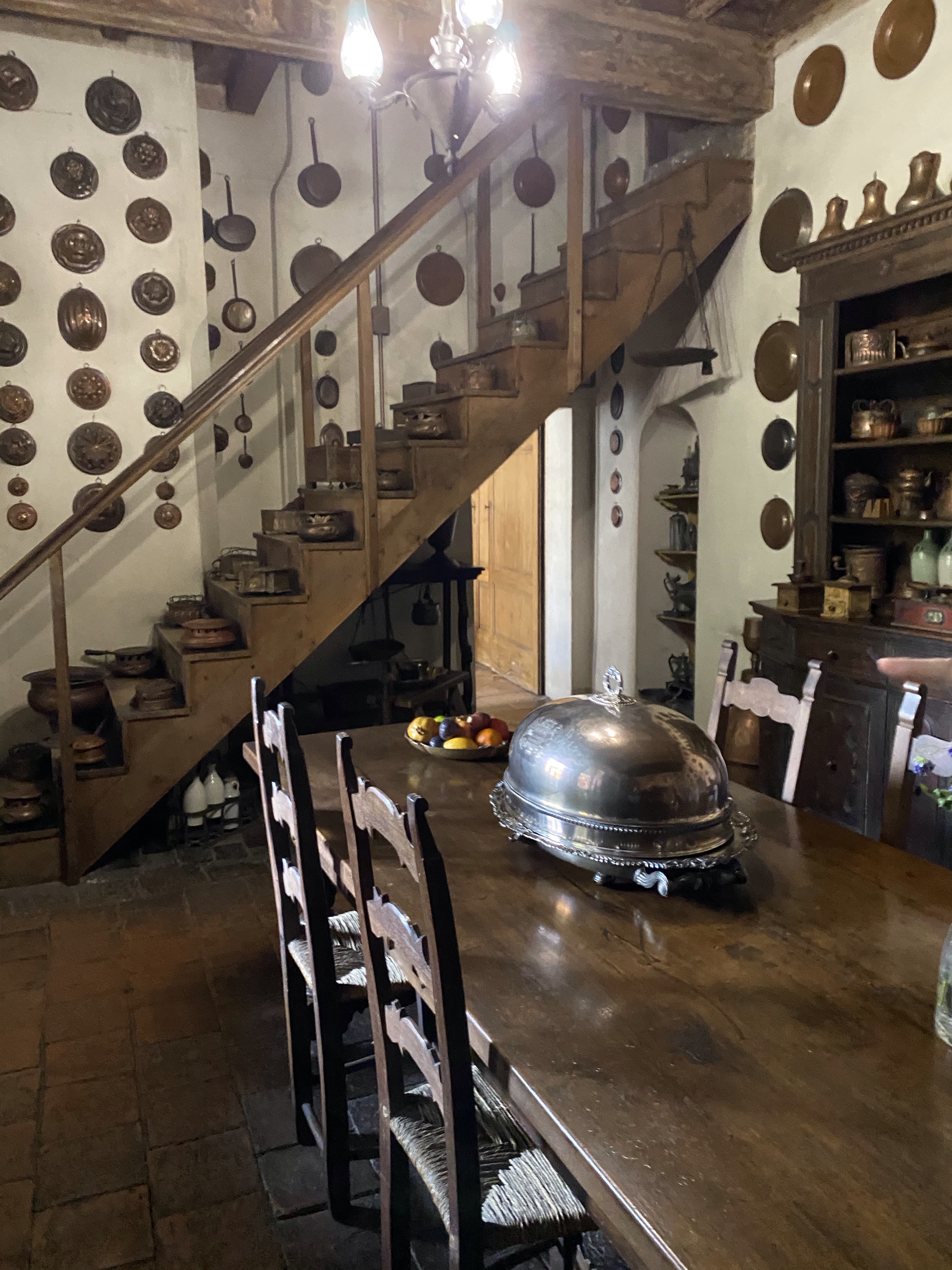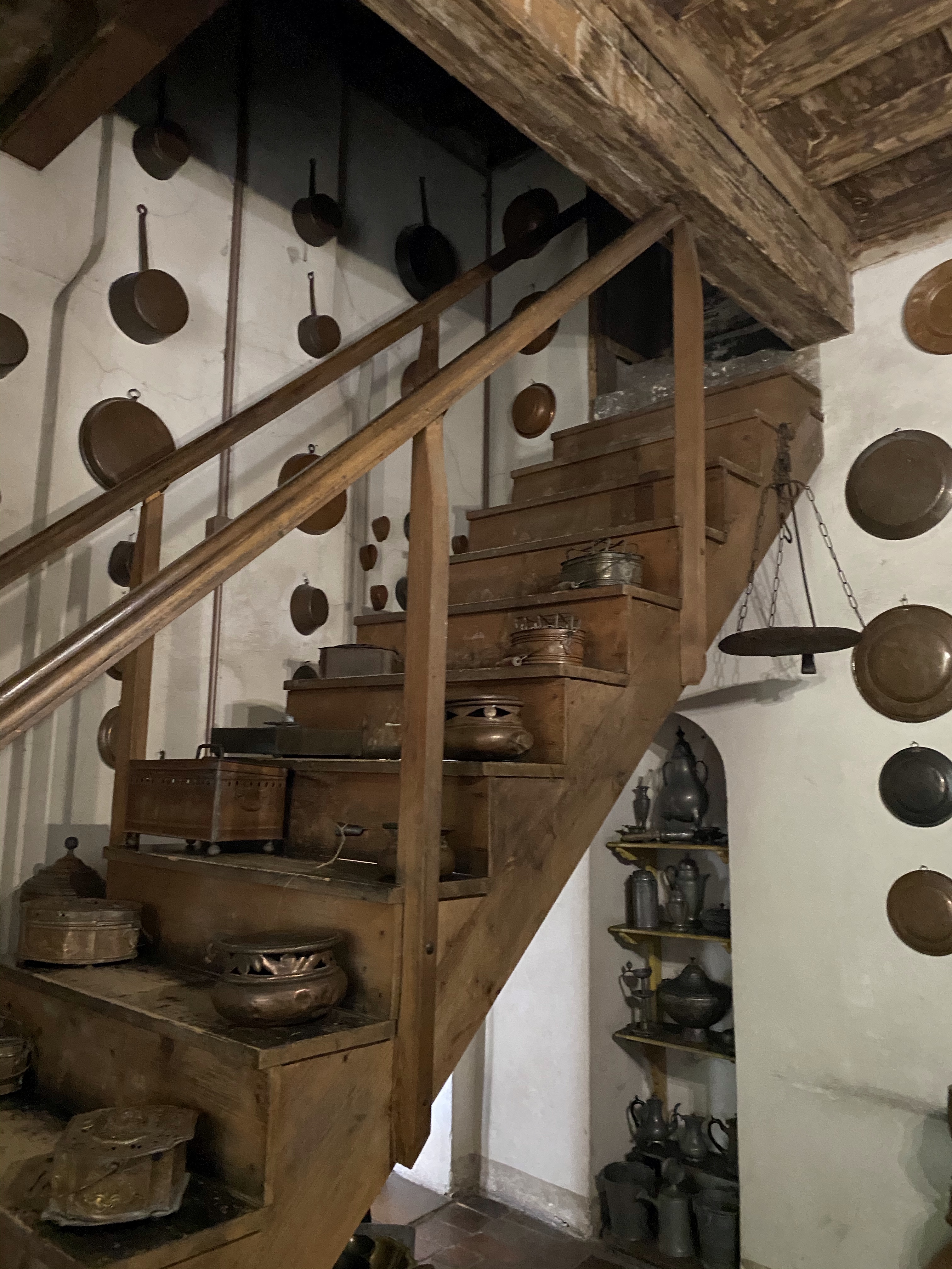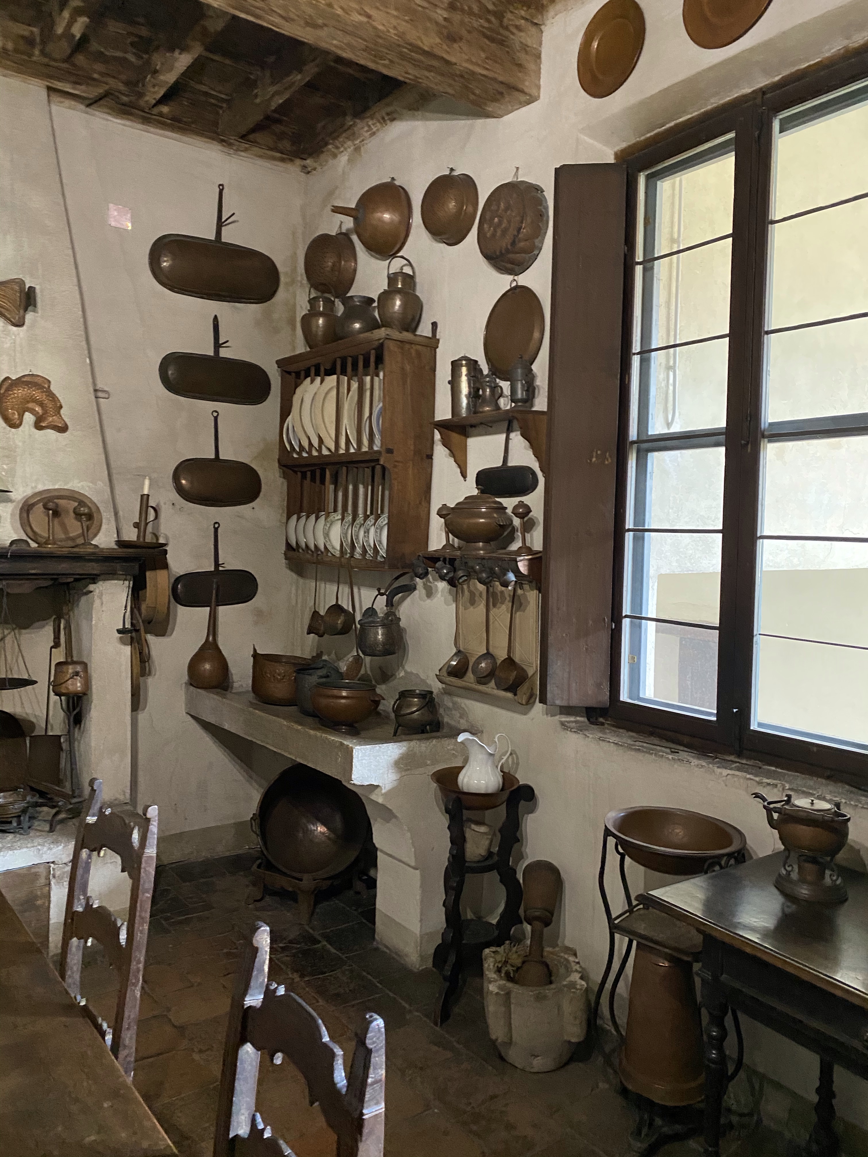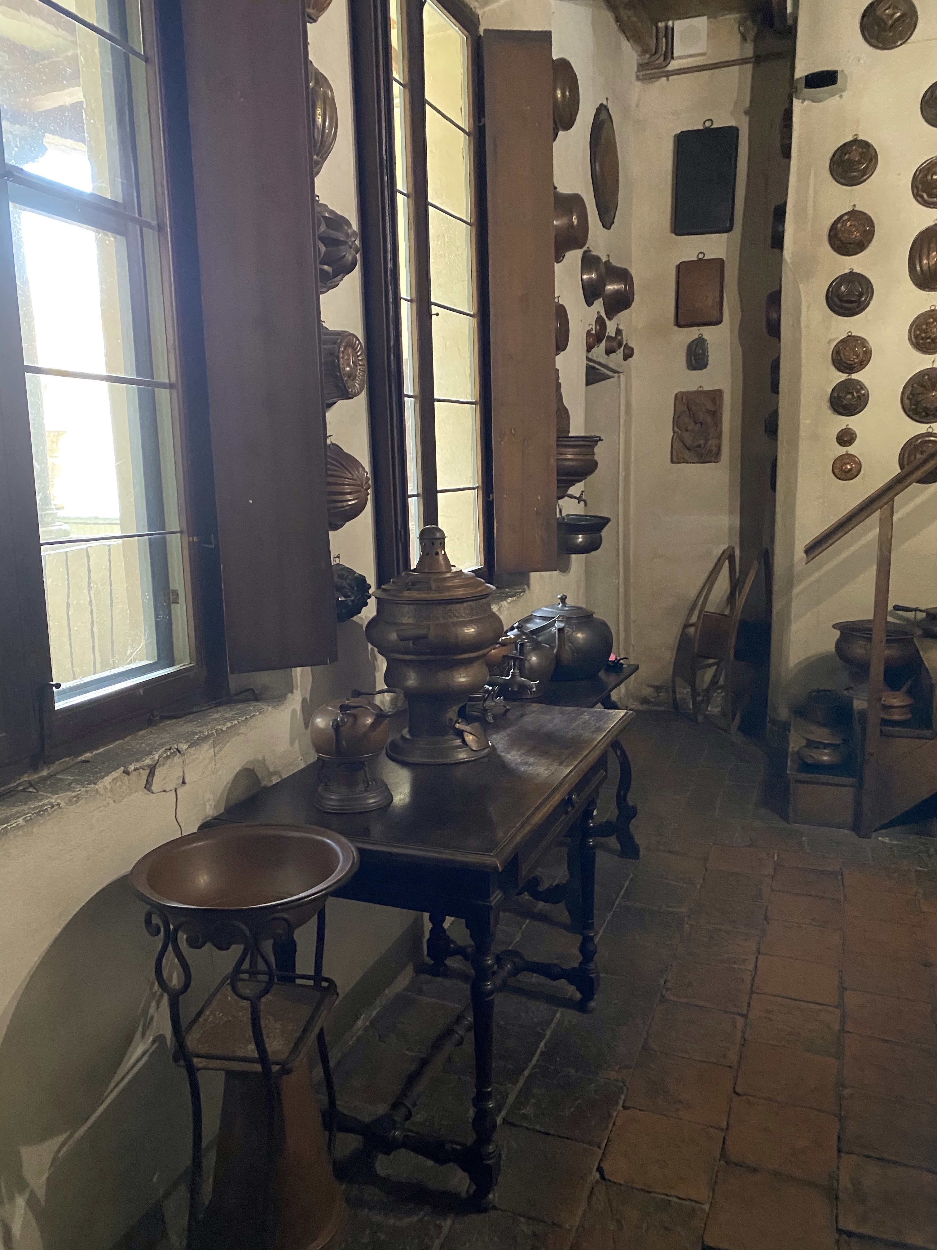 The kitchen dates to the 19th century and is a pleasant, small room where utensils and pots, pans and molds of copper, brass and pewter are displayed. The following description of the kitchen and its implements is taken from the palazzo’s website: