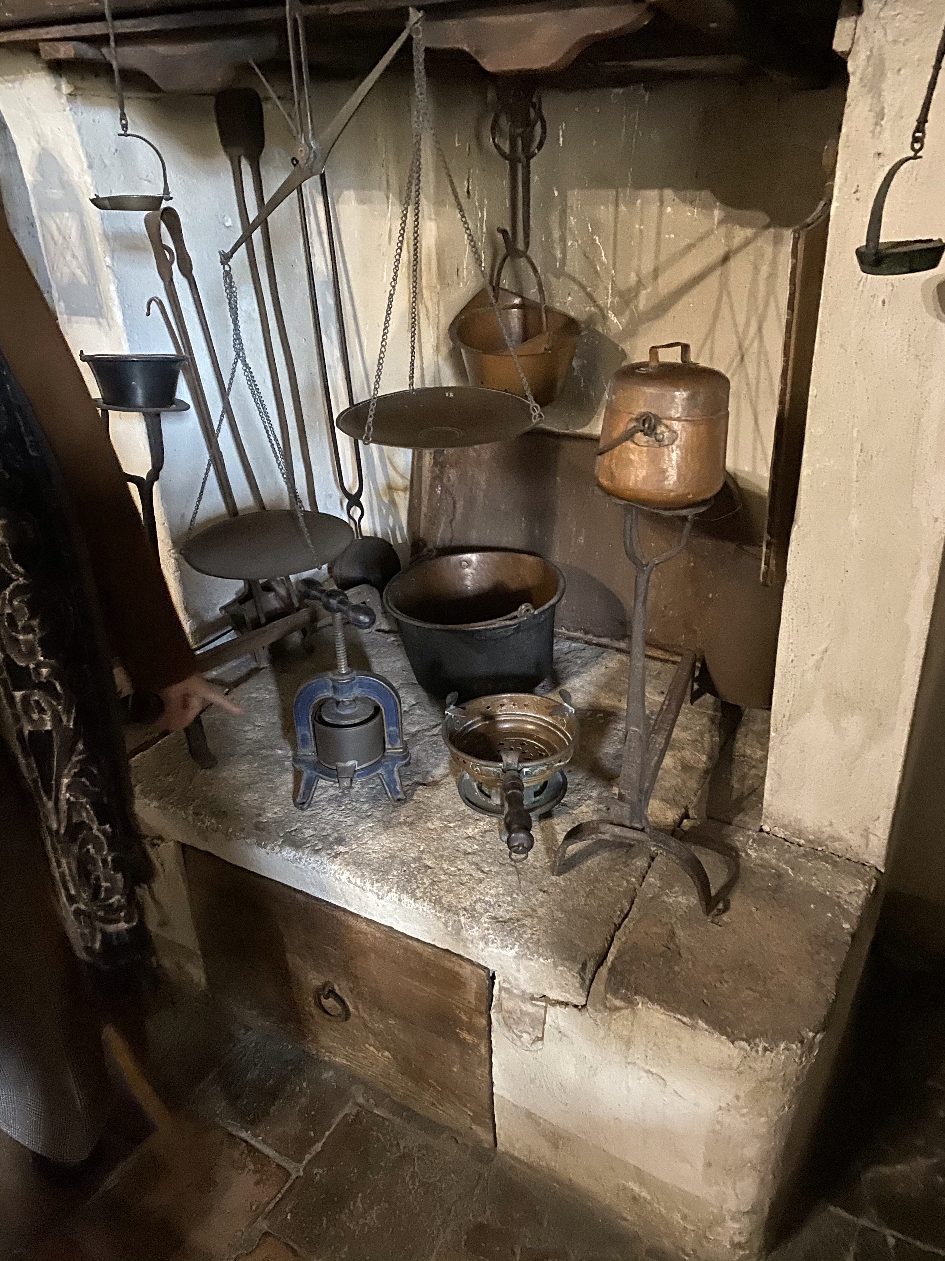On the steps are hand warmers. Under the staircase is a steelyard, the bottle holder and an ancient coffee grinder.