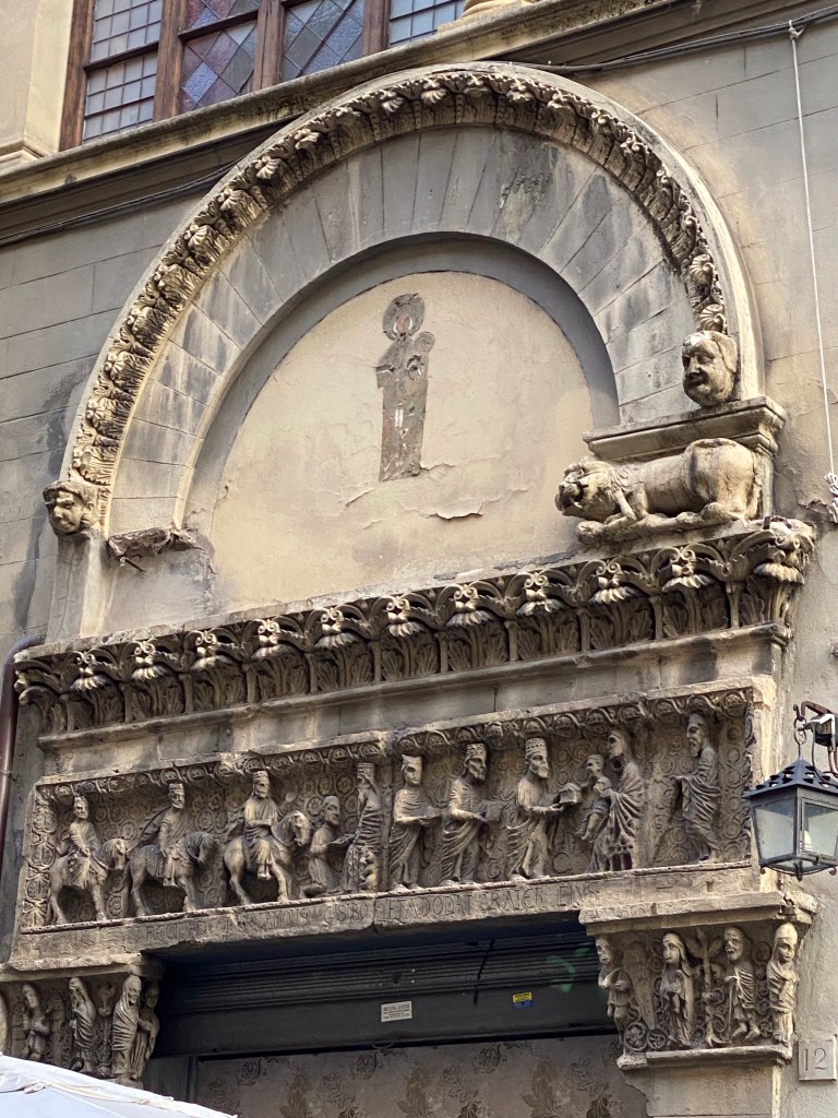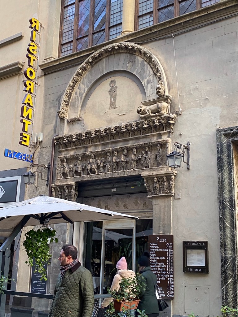 It is not at all unusual in Italy to see old facades left intact and just covered over with the newer inhabitant. A case in point is this Medieval church facade that hovers over a modern pizzeria.