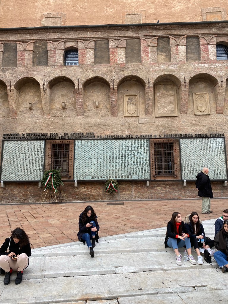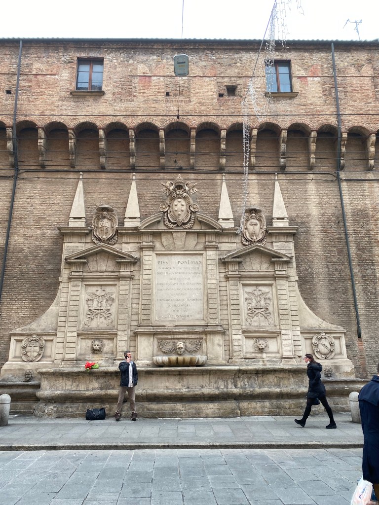 Plaques and bas-relief sculptures cover the fountain, including family coats of arms and the Papal crown and keys in the center in honor of Pope Pius IV. A member of the Medici, his coat of arms is displayed beneath the crown and keys. There are also other symbols displayed on the fountain, such as the word “Libertas,” which represents the city of Bologna. You’ll see the word in a variety of locations throughout the city.