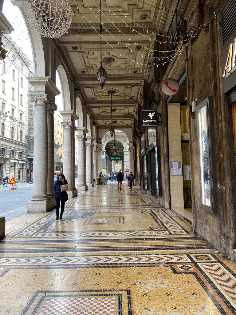 At the end of the passage on via Galliera, the Maccaferri building, home of the café chantant Eden, will be built three years later. The staircase is equipped with 72 cast iron candelabra with six or four lamp posts. The steps are joined to the parapets by marble edges, which will often be used by children as slides (sblisgàn).