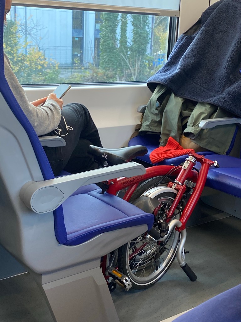 I was completely enjoying my train ride, admiring the red and golden grape vines that flew by my window, and noting this guy’s foldable bike.